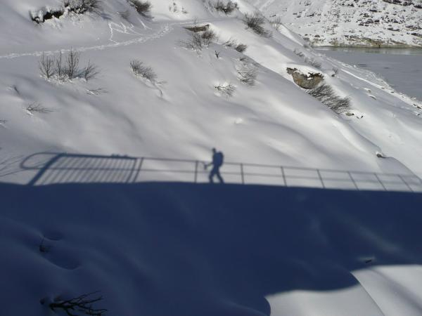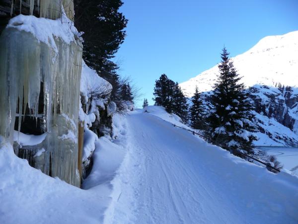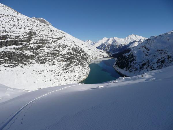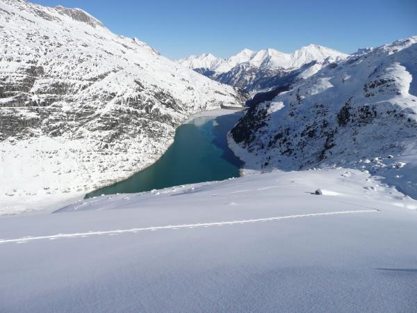 Start an der Staumauer bei -11°C. Aufgebauter Pulverschnee auf fester Unterlage. Am See 15-20cm, oben 30-40cm. Der direkt Aufstieg zum Furggeltihorn vom Joch ist sehr felsig und stark verblasen. Daneben schon Schneebretter abgegangen.