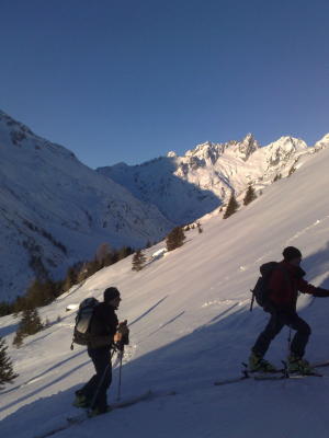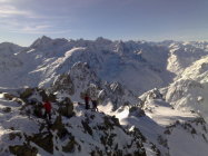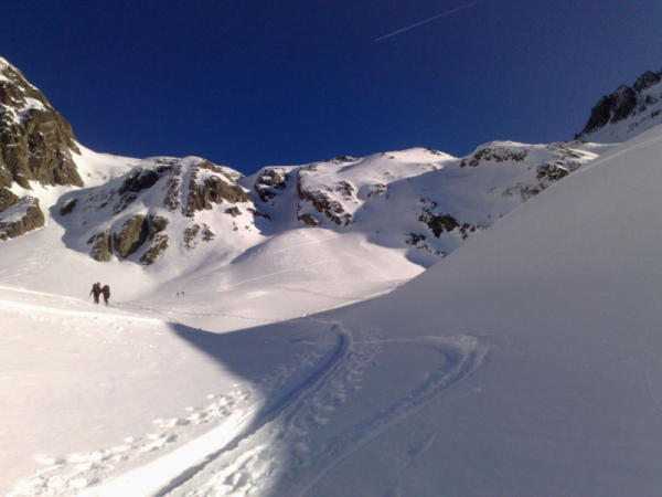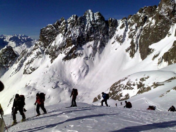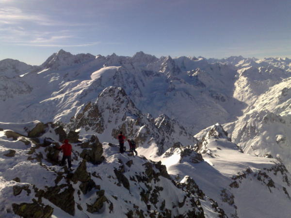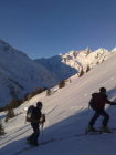 Sehr gute Spur von zuunterst bis zuoberst. Schnee dank Kälte erstaunlich locker, insbesondere auch in den beiden Steilstufen. Bis zum Skidepot praktisch windstill, und die Sonne wärmte wohltuend, denn im Schatten war es eisig kalt. Gipfelkraxelei dank Fixseilen und wenig Eis problemlos.