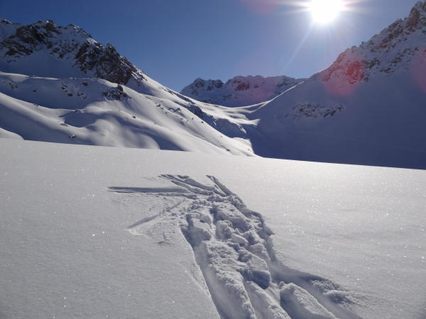 Wir sind durchs Mitteltälli abgefahren. 20 cm Pulver auf Kruste und gut zu fahren.