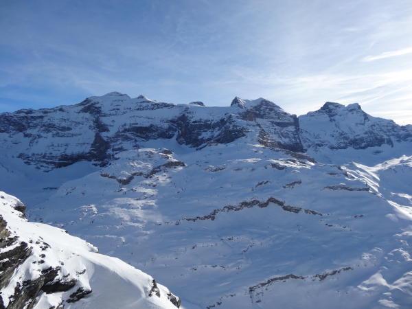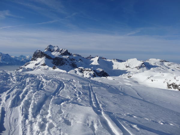 Pulverschnee auf zum Teil noch tragender harter Unterlage, unterhalb Unter Stafel schon sehr zerfahren, oben gibt es immer noch schöne, z.t. unberührte Hänge
