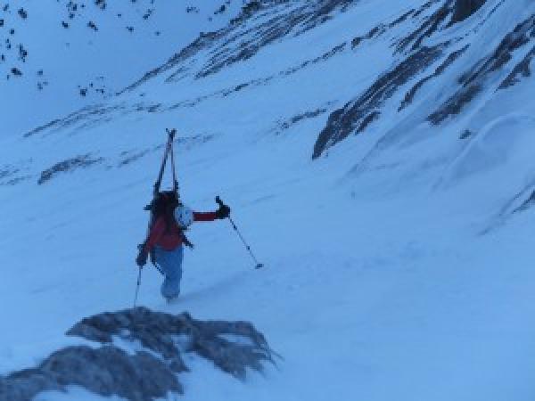 Gipfelhang hart mit Gipfelwechte. Abfahrt mit viel Harsch und Deckel.