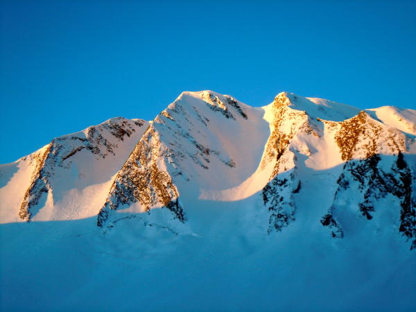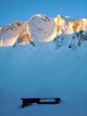 Die Aufstiegsspur gleicht einer Autobahn :) Für die Abfahrt habe ich das grössere Ostcouloir gewählt und dabei noch super schönen Pulverschnee gefunden.