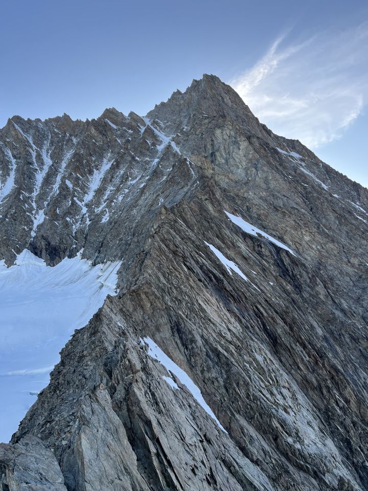 Die Bedingungen auf dem Rest der Tour sind allerdings gut bis sehr gut. Gestern 26.06. fiel einiges an Neuschnee ab ca. 3500m, was aber auf dem SW-Grat nicht gross stört. Man muss halt länger mit den Steigeisen laufen.