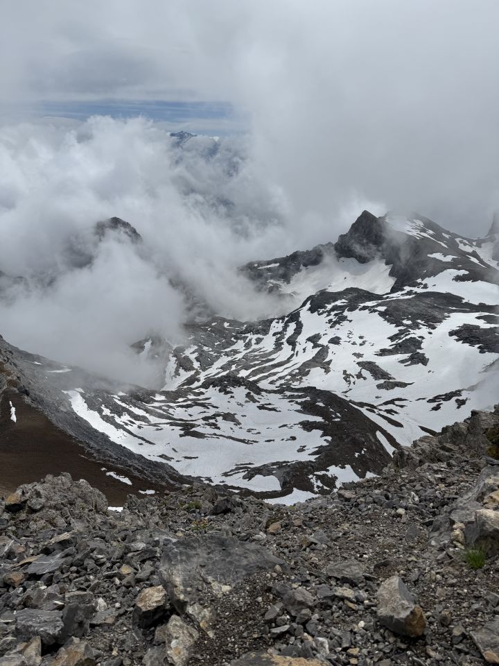 Von Musenalp bis P. 2287 m hat es noch drei kurze Schneefelder, der Weg nach dem Firnbach ist gut rausgeputzt und oben an der steilen Stelle bei P. 2287 ist der Schnee weg und die Ketten können benutzt werden. Danach zuerst wenig, dann ab 2575 m doch immer wieder längere Schneefelder, die heute gut zu gehen waren. Auf dem neuen Weg (ab 2720 m, am Schluss alles unter Schnee) auf den SE-Ausläufer und von dort alles schneefrei auf den Uri Rotstock.