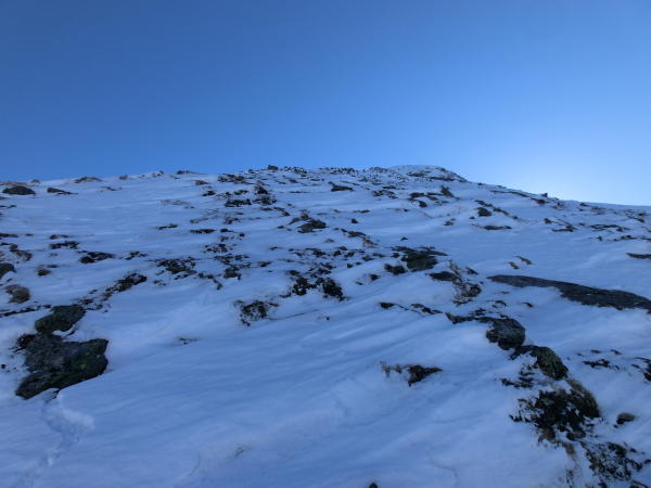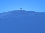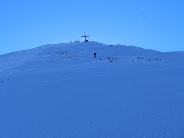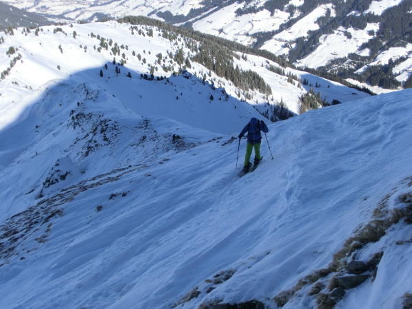 Generell würde ich die Abfahrt über die verblasene Nordflanke nicht empfehlen; wir sind den Gipfelgrat etwas nach Süden gegangen und dann in die (am Samstag) noch unverspurte Ostflanke hinabgefahren: top Pulver auf tragender Harschdecke; jedoch der Hang ist steil, also nur bei besten Voraussetzungen fahren und geringer Lawinengefahr; nach einer Querung un einem weiteren tollen Hang kommt man auf der Rodelpiste raus und zurück zum Parkplatz;