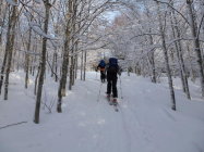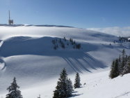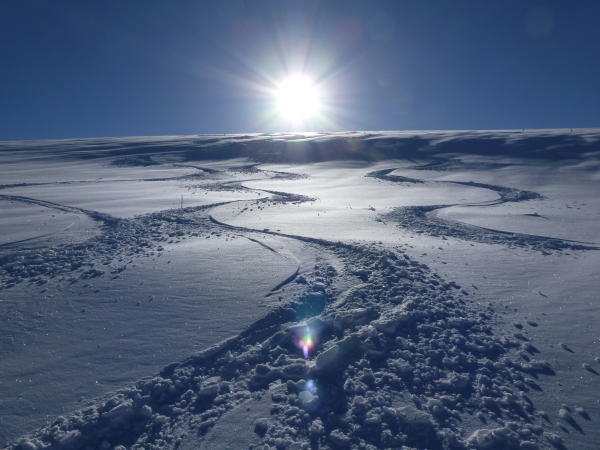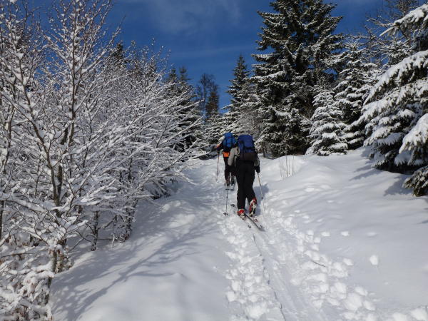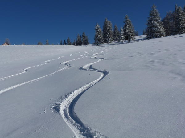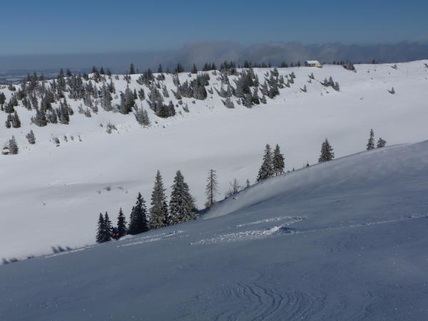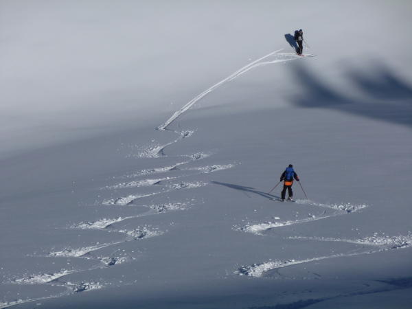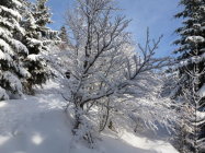 Unterhalb 1000m relativ wenig Schnee (Süd- wie Nordseitig). Darüber aber sehr gute Verhältnisse. Der frische Pulver der vorangehenden Nacht war ein Traum. Im Gipfelbereich etwas windgepresst.