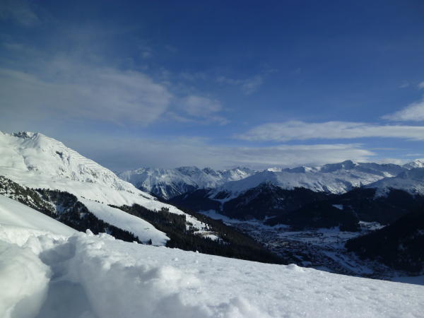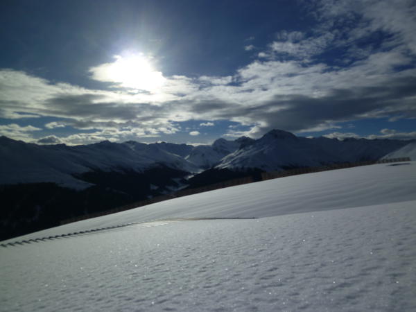 Anfangs Sonnenschein und Pulverschnee - später beginnende Eintrübung und massive Erwärmung. Abfahrt bei besten Pulverbedingungen links vom Hanengretji bis zur Mulde und Wiederaufstieg zum Grüenihorn mit anschliessend herrlicher Pulverabfahrt bis Grüenialp. Dort bereits nasser Schnee aufgrund der Erwärmung - Talabfahrt über den Sommerweg bis Davos Spital.