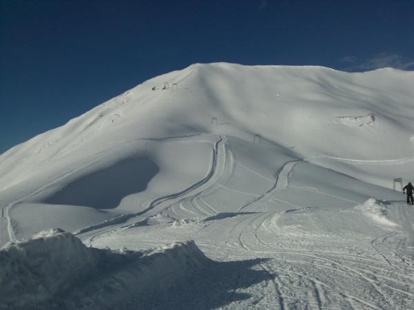 Nordosthänge immer noch Pulver, Südosthänge noch nicht durchgefroren. Auf dem Gipfel starker Föhn.
