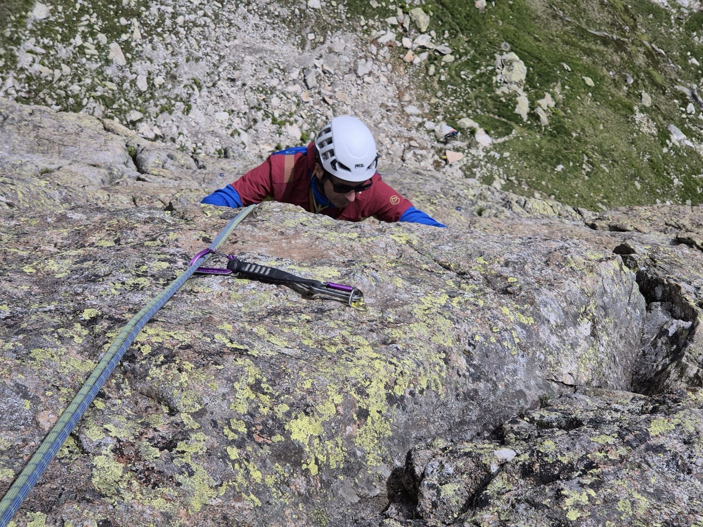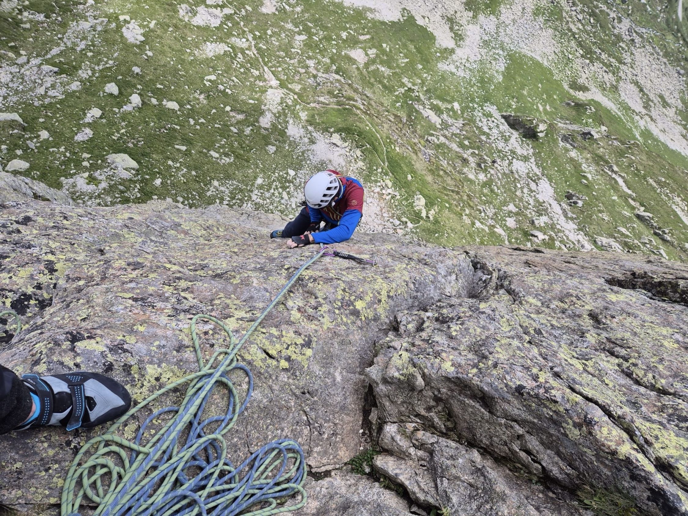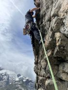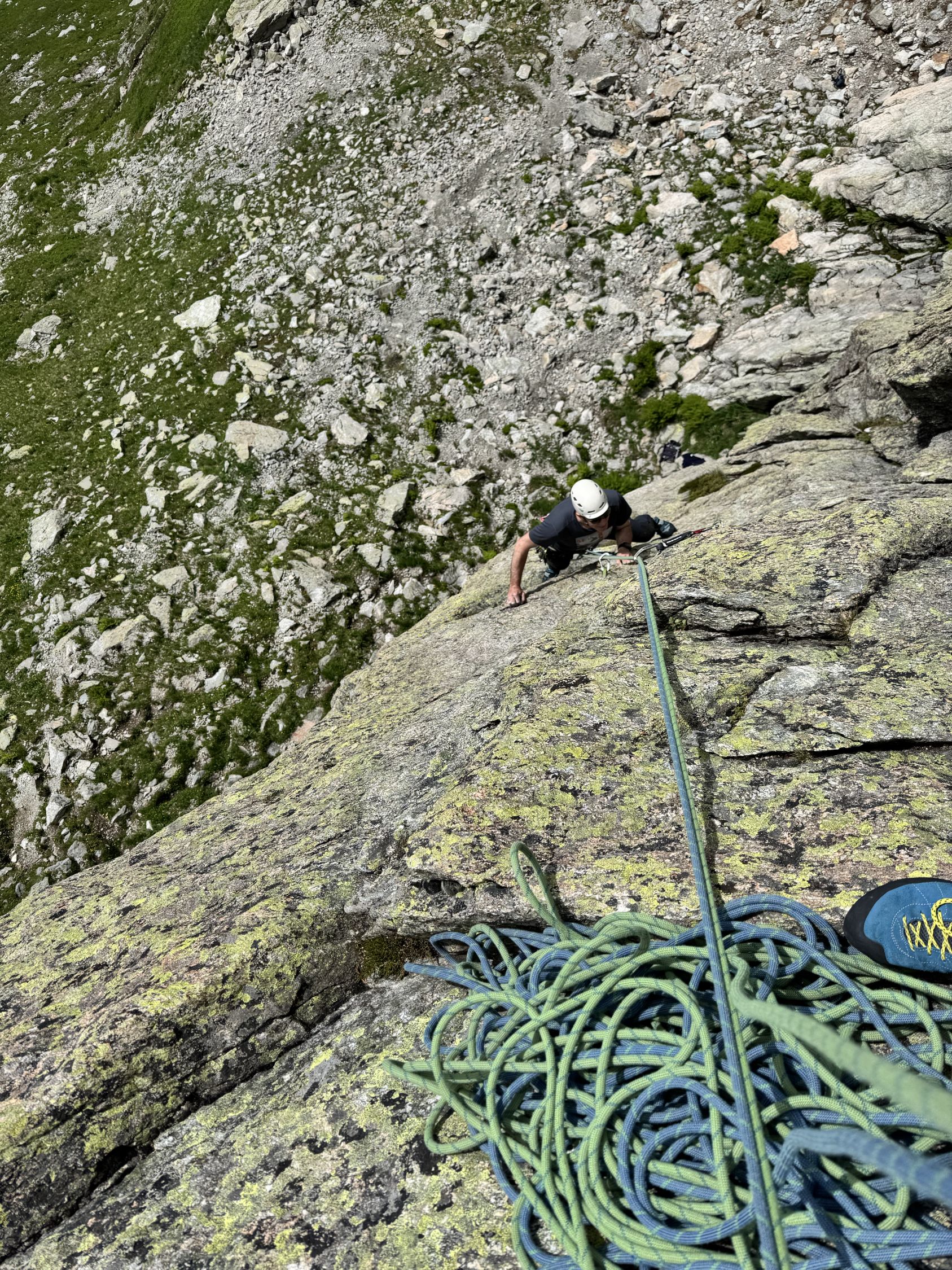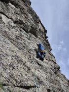Tolle Kletterei am Pfrindler. Nochmals anhaltender und schwieriger als Troimli. Zum Glück ist man schon vom Zustieg aufgewärmt :-) denn in der ersten SL wird man gerade mal gefordert. Jede SL hat Ihren speziellen Charakter. Mit den highlights in SL 3,4 und 5. Fantastische Route im soliden und steilen Gneis. Immer den gelb markierten Haken folgen. Den einen oder anderen Keil, Friend kann man schon platzieren wenn man dann möchte :-)