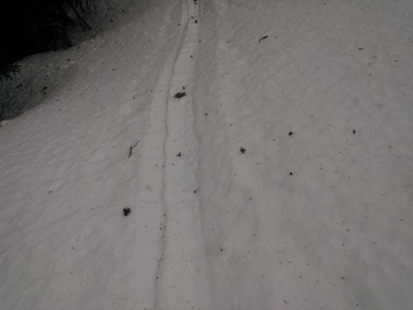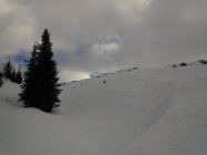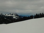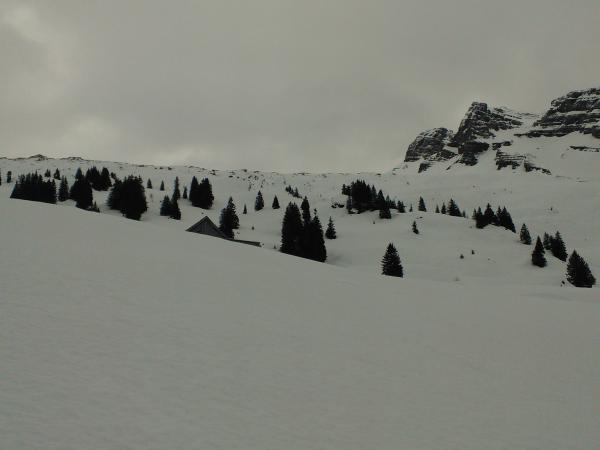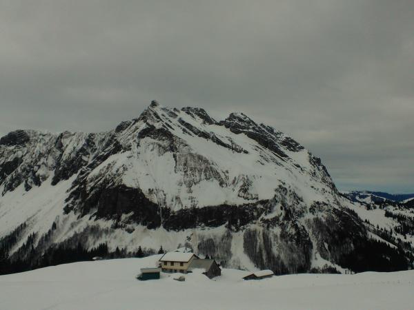 Wind und Regen haben ganze Arbeit geleistet. Vom Start bis zum Gipfel hinauf völlig durchnässter Schnee. Die Spur war im unteren Teil noch sichtbar, weiter oben dann musste ich neu spuren. Leider war das Wetter gar nicht so toll, zwar gabs die erwartete Wärme (7 Grad beim Start...), leider blieb die ebenfalls erwartete Aufhellung aus. Kurz unter dem Gipfel sah es so aus, wie wenn es völlig zumachen würde, was ich aufgrund des unübersichtlichen Geländes in der Abfahrt nicht riskieren wollte. Daher kehrte ich um. Die Abfahrt, hm, nunja, erfolgte grösstenteils in der Aufstiegsspur, da das Gelände im oberen Teil zu flach respektive der Schnee zu klebrig war. Vor Rinderweid dann hübsche Schwünge im Nassschnee, ab Rinderweid pistenartig.