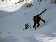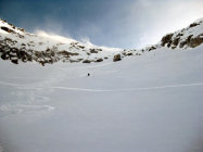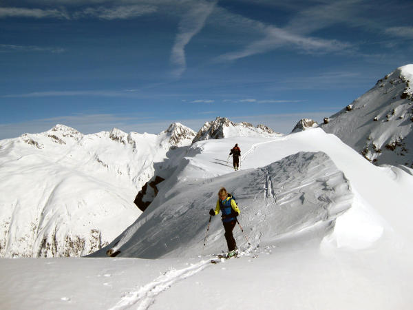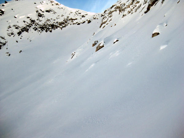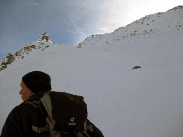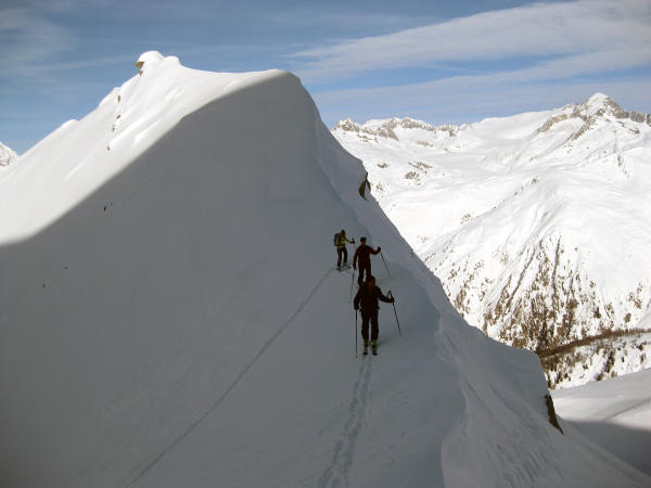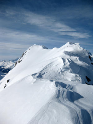 Bedingt durch den Regen am Vorabend bis ca. 2000m hart, anschliessend zunehmend windverblasene Stellen, teilweis leichte Triebschneeblasen, oberhalb 2600m ausgeprägtere Stellen, jedoch gut begehbar/stabil. Grat konnte nur zu Fuss erreicht werden (ca. 15 Hm).
