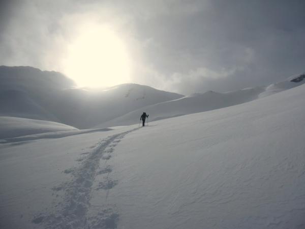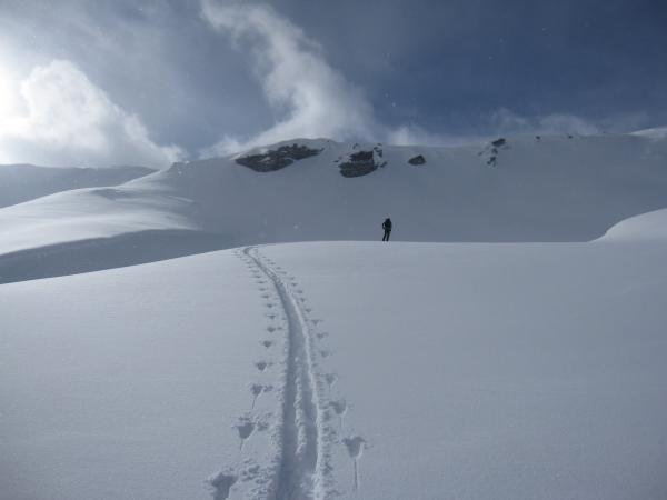 Viel Neuschnee, starke Windverfrachtungen. SLF Stufe 3, insgesamt kritische Verhältnisse. Spätaufsteher wurden belohnt. Am Nachmittag riss die Wolkendecke auf und bei guter Sicht war es möglich eine objektiv sichere Route zu legen. Mulden und Rinnen waren mit sehr viel frischem Triebschnee geladen und müssen vermieden werden!