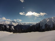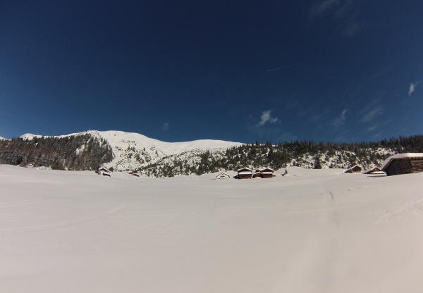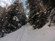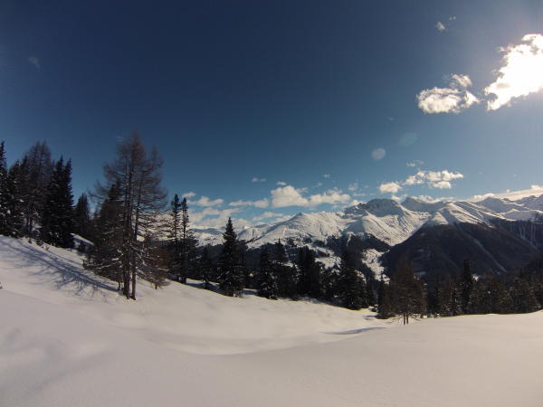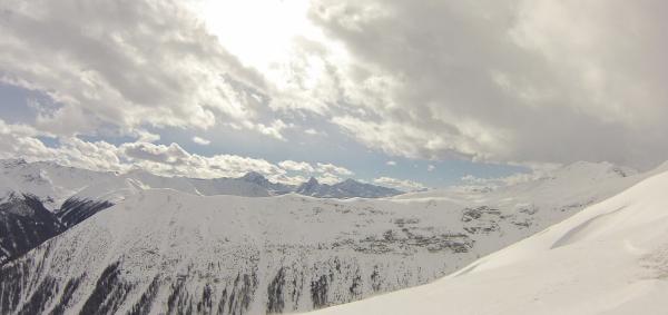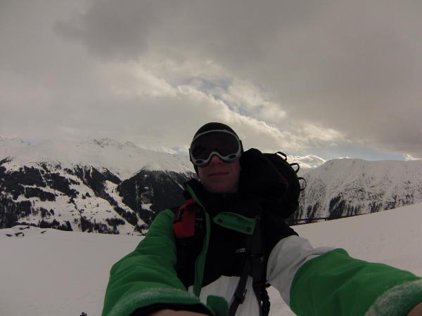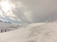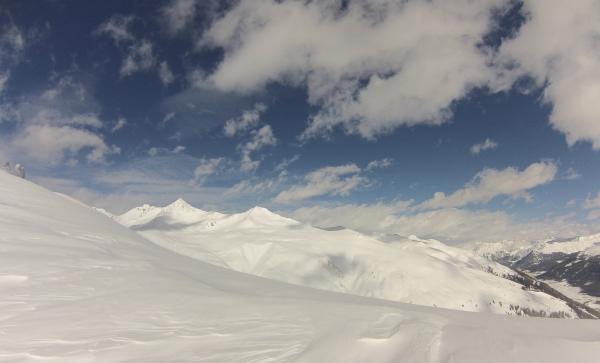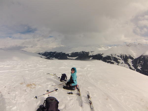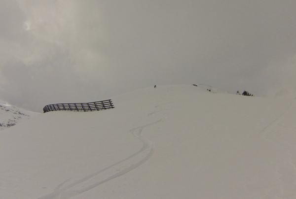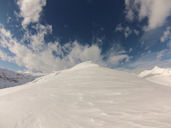 Im unteren Teil schöner Pulverschnee, oben starke Schneeverwehungen und windgepresster Schnee. Auf dem Gipfel kommen die Steine hervor, doch Alles in Allem sehr genussvoll.