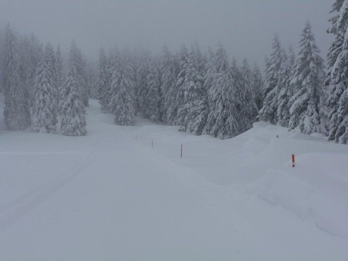 Sehr viel Neuschnee. Bis hinunter nach Buttes. Leider hatte es Heute auch sehr viel und vor allem im Gipfelbereich, dichten Nebel und Wind. Desshalb ist entsprechende Vorsicht beim Gipfel angebracht. Denn nordseitig bricht der Gipfel senkrecht über Felsen ab.