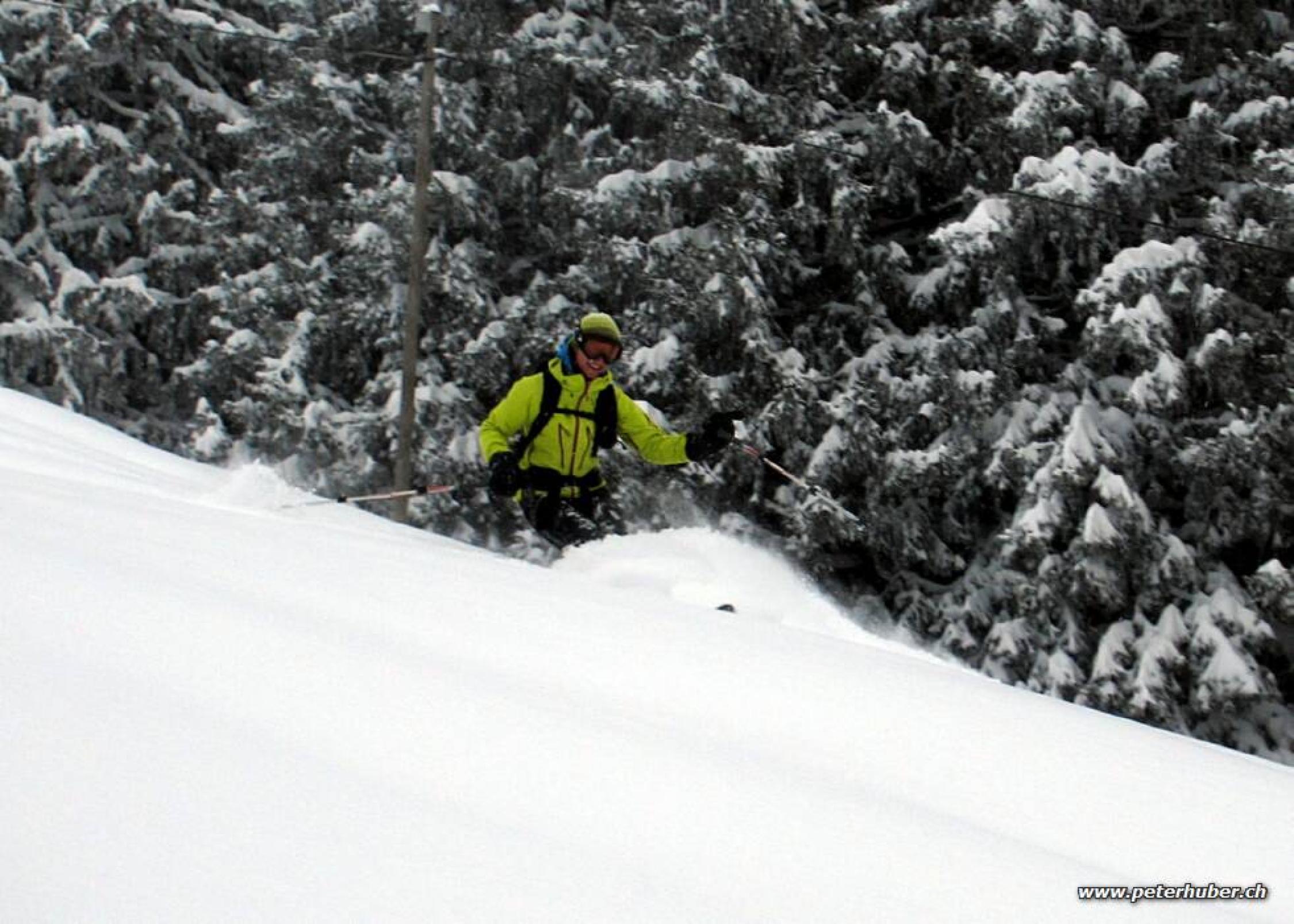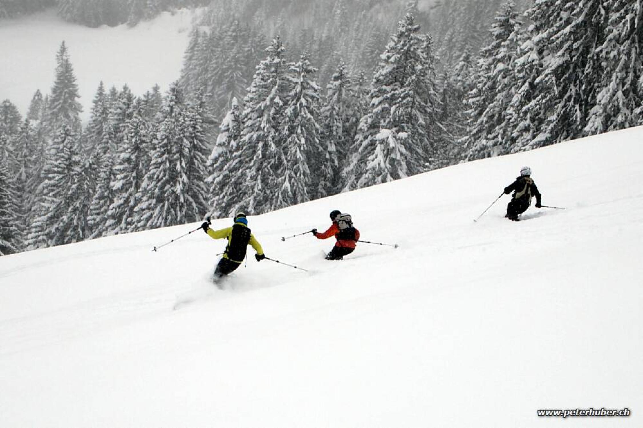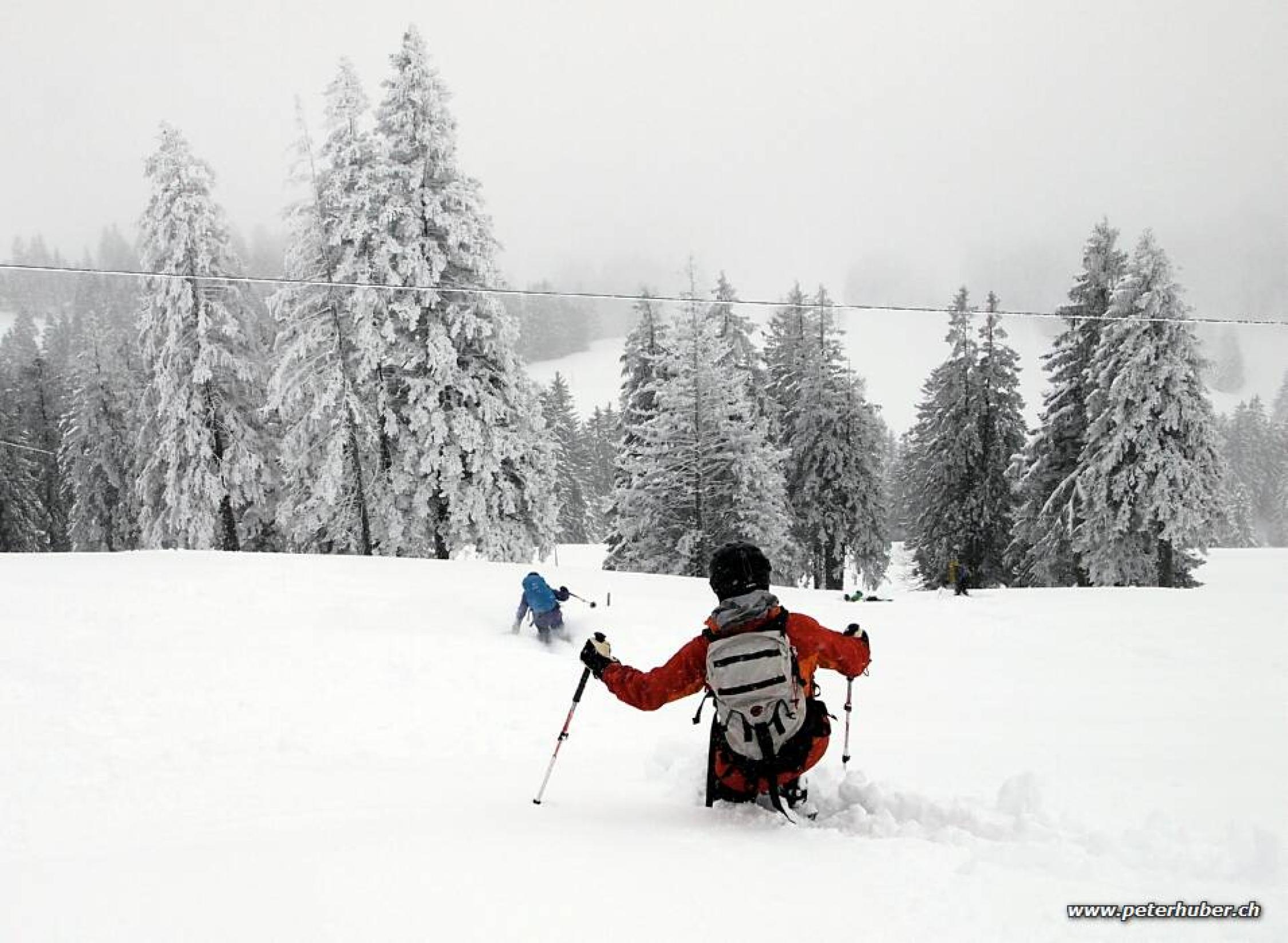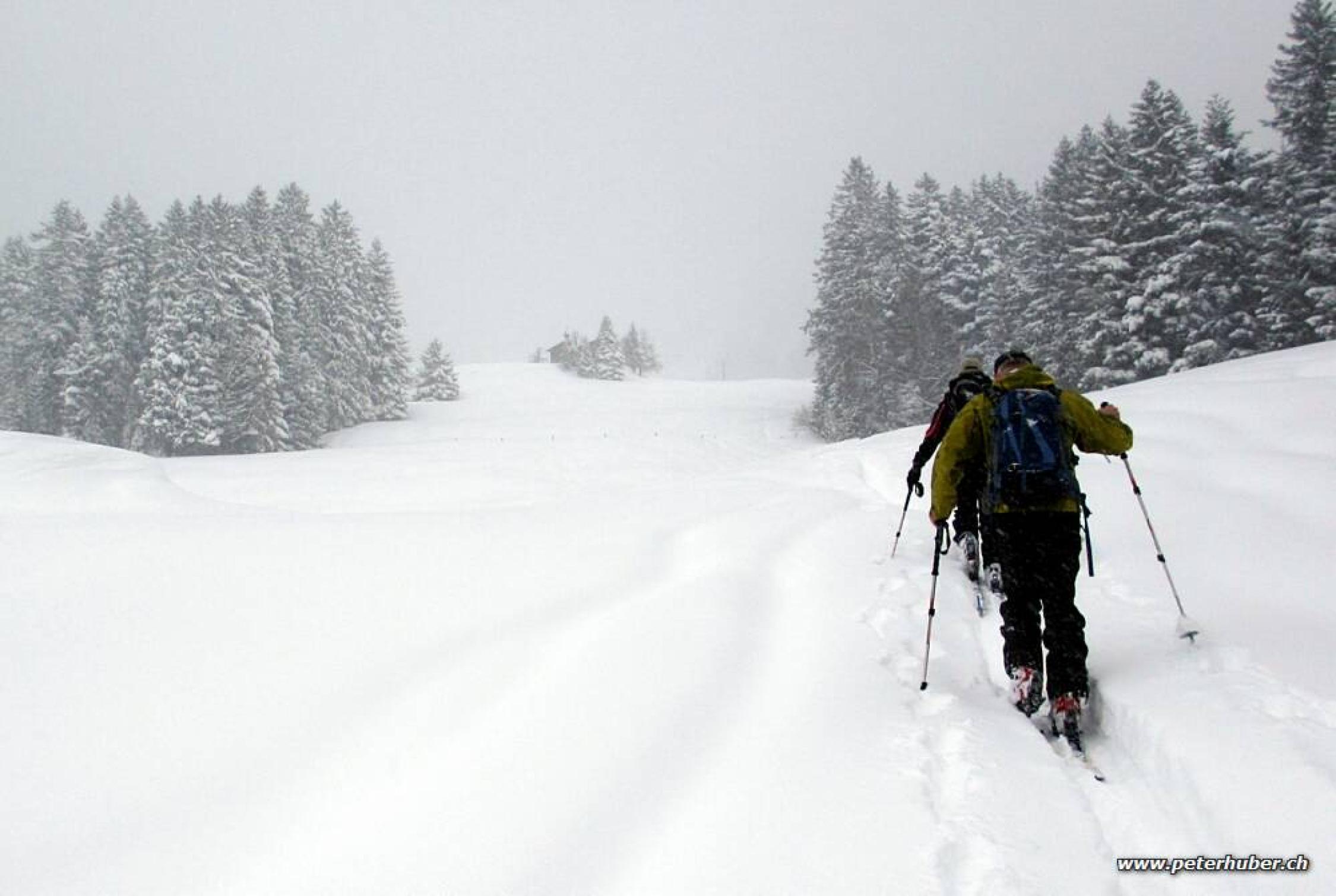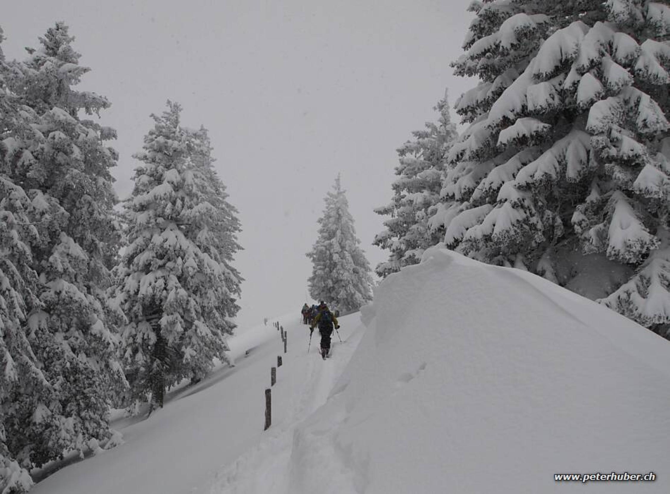 Neblig, meist leichter Schneefall. Sicht Ok. Es hat viel Schnee von der Strasse weg. Unten ca. 40 cm Neuschnee auf weicher Unterlage. Oben mehr - kaum verblasen. Für die Abfahrt hat es in den flacheren Stücken zu viel und wir musste die Aufstiegspur zu Hilfe nehmen. Im steilen genial! Powder stiebt bis zum Hals!