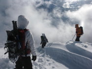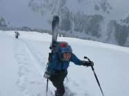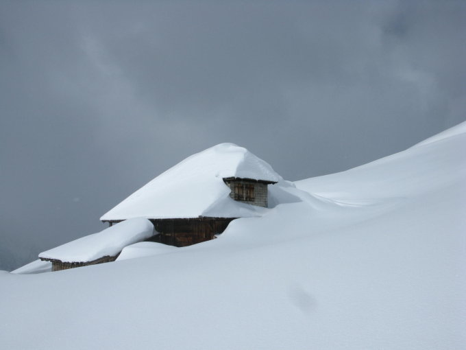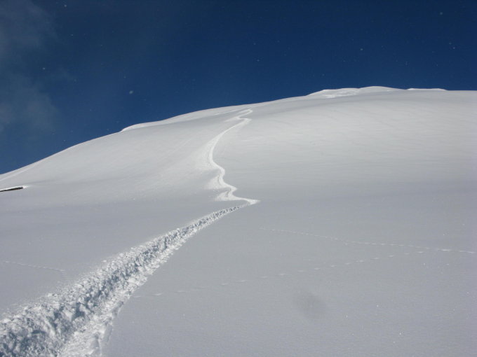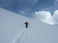 Fast unglaubliche Mengen Pulverschnee am ganzen Berg, haben hier noch nie vorher soviel Schnee gesehen! Dementsprechend harte Spurarbeit, hat sich aber gelohnt! Allgemein lockerer Schnee mit noch wenig Windeinfluss.Vereinzelt ansatzweise gebunden, die Tour war aber heute sicher durchführbar,ewas defensive Routenwahl vorausgesetzt.