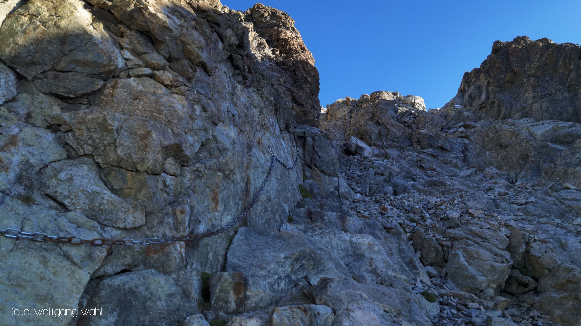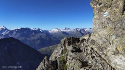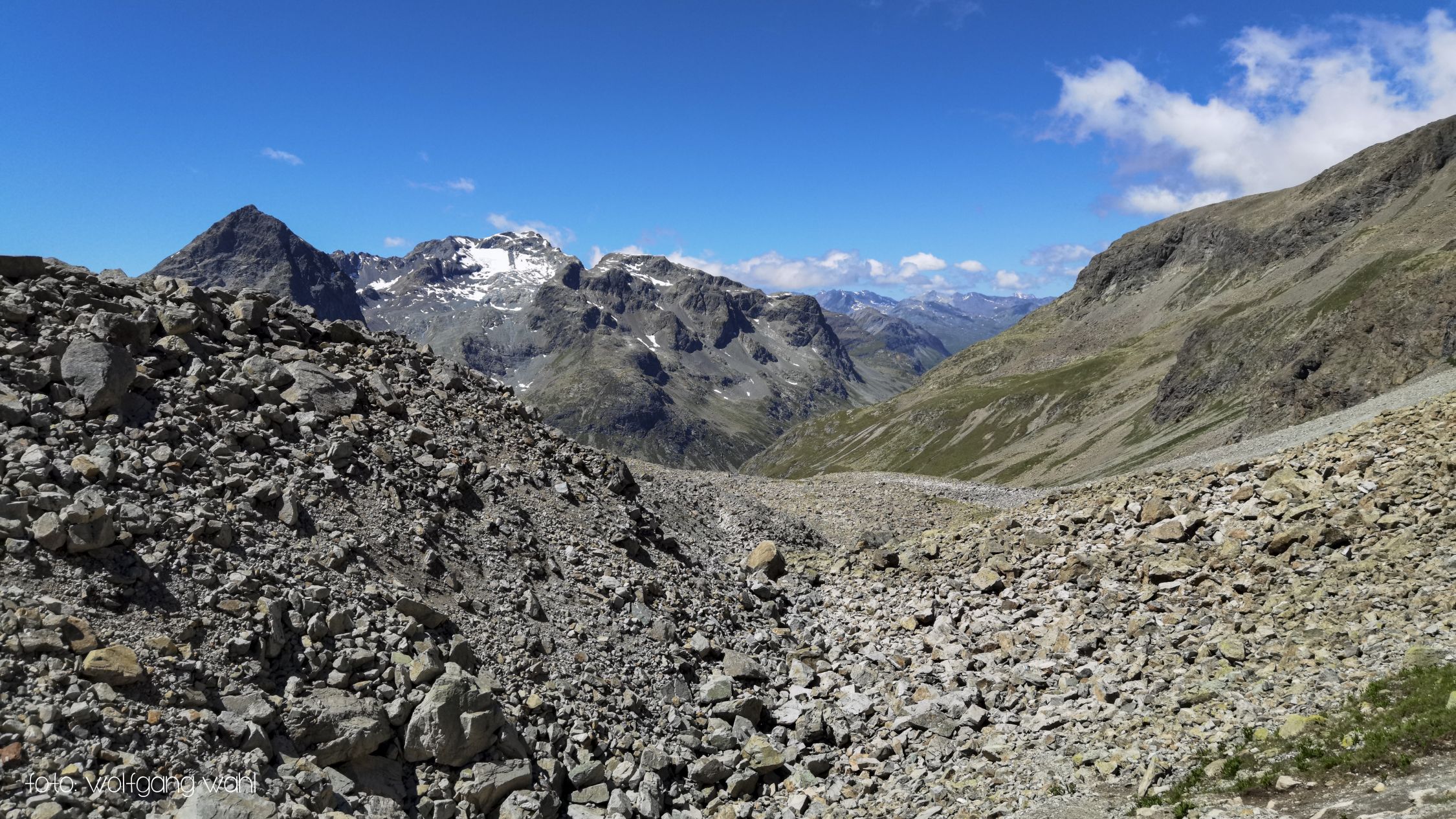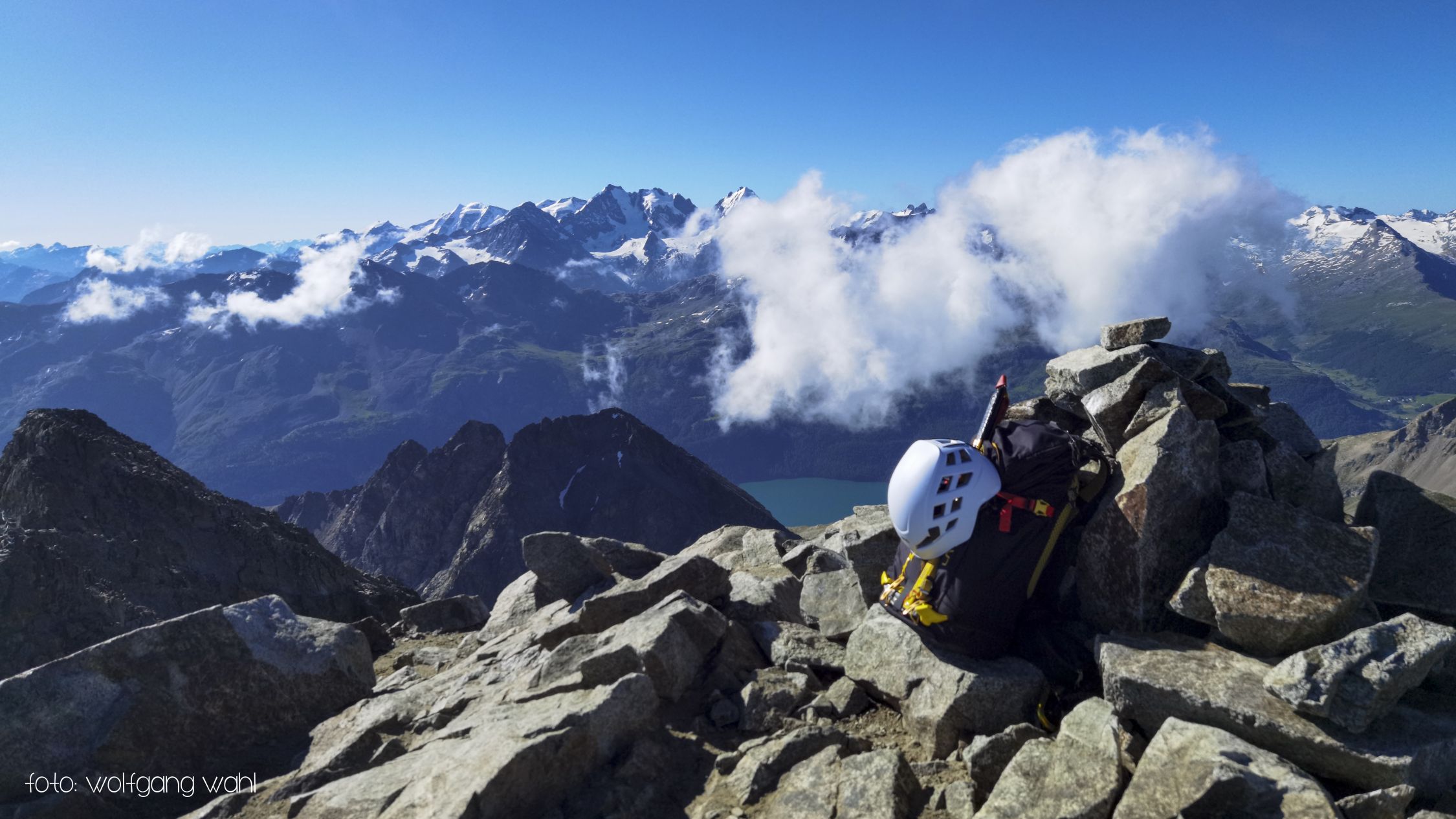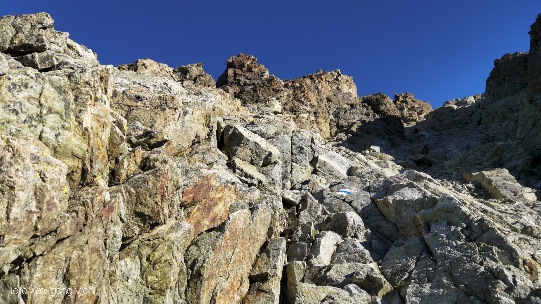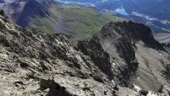 Vom kostenlosen Parkplatz auf der Alp Güglia bei Chamanna dal Stradin auf 2’161m, über P2233 zu P2371, weiter ins Munteratsch Suot, hoch zur Fuorcla Albana, ist der weiss-blau-weiss markierte Bergweg schneefrei, trocken und gut zu gehen. Auch der weitere Aufstieg über den langen Grat Crasta da la Senda zum Gipfel des Piz Julier / Piz Güglia ist komplett schneefrei, mit Ketten fast schon übermässig gesichert und gut zu gehen. Vor allem im ersten Teil des Klettergeländes ab 2’950m bis 3’100m liegt viel Schutt, sind viele Berggänger unterwegs, besteht Steinschlaggefahr. Ansonsten ist das schöne Kraxelgelände bis zum Gipfel auf 3’380m einfach und gut zu gehen. Auch der Abstieg über dieselbe Route ist trocken und angenehm zu gehen.