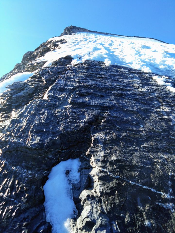 Schnee nur oberflächlich gefroren, Felsen an vielen Stellen noch nass, zum Glück bei uns nicht vereist, auf 3220 ist der Felsriegel aper, ein Stand am unteren Ende liegt frei, am oberen Ende keine Sicherungsmöglichkeit und plattige Felsen mit dünner Eisauflage. Hier haben wir umgedreht. Laut Auskunft des Hüttenteams werden im Verlauf des Sommers Stangen angebracht sobald die Flanke ausgeapert ist.