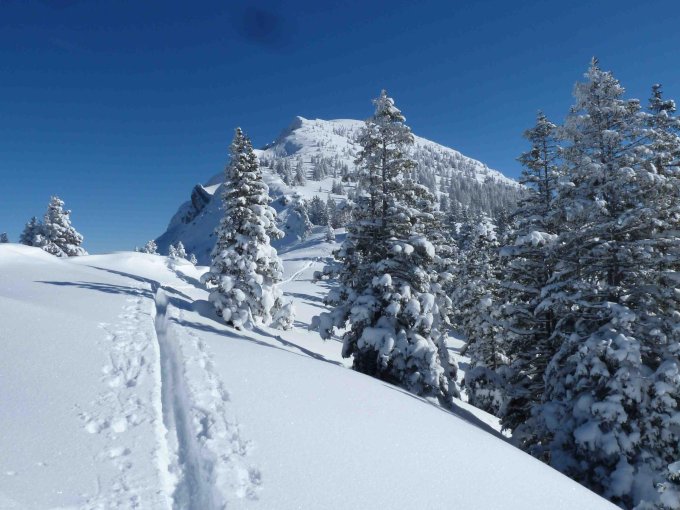 Guter Pulver mit Unterlage auf der ganzen Strecke. Gipfelflanke nicht abgeblasen und Pulverschnee bis zum Gipfel