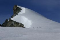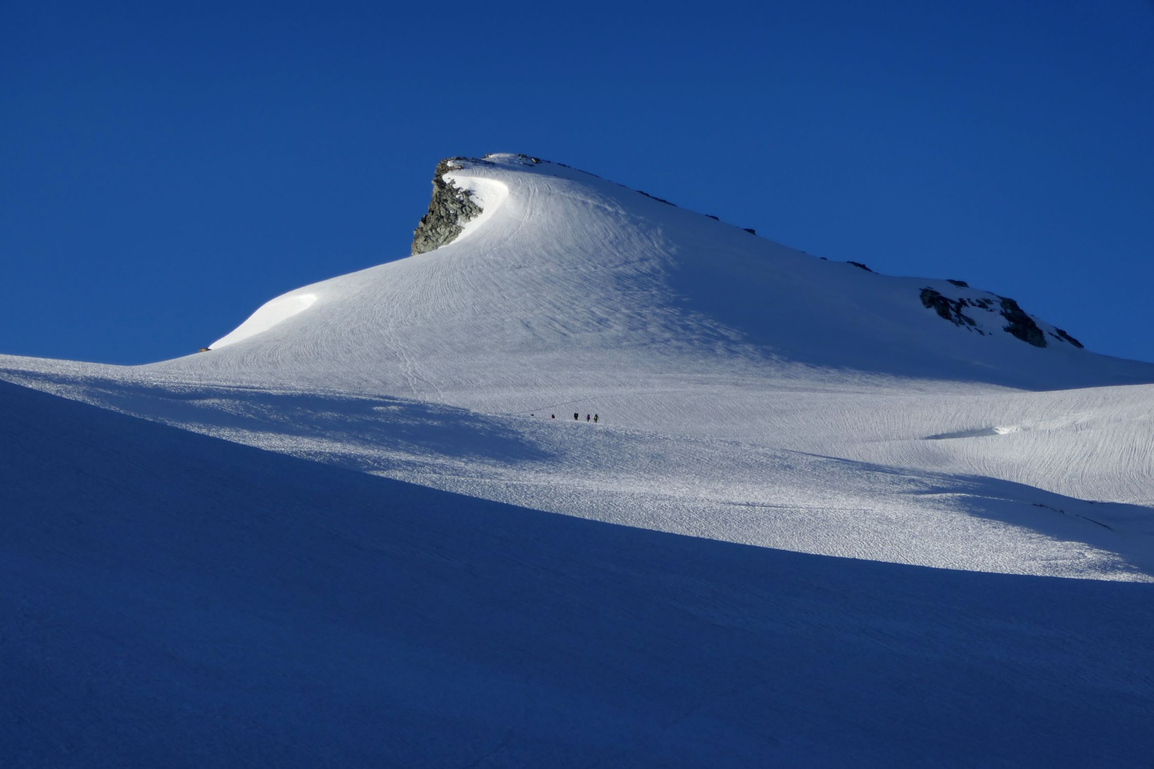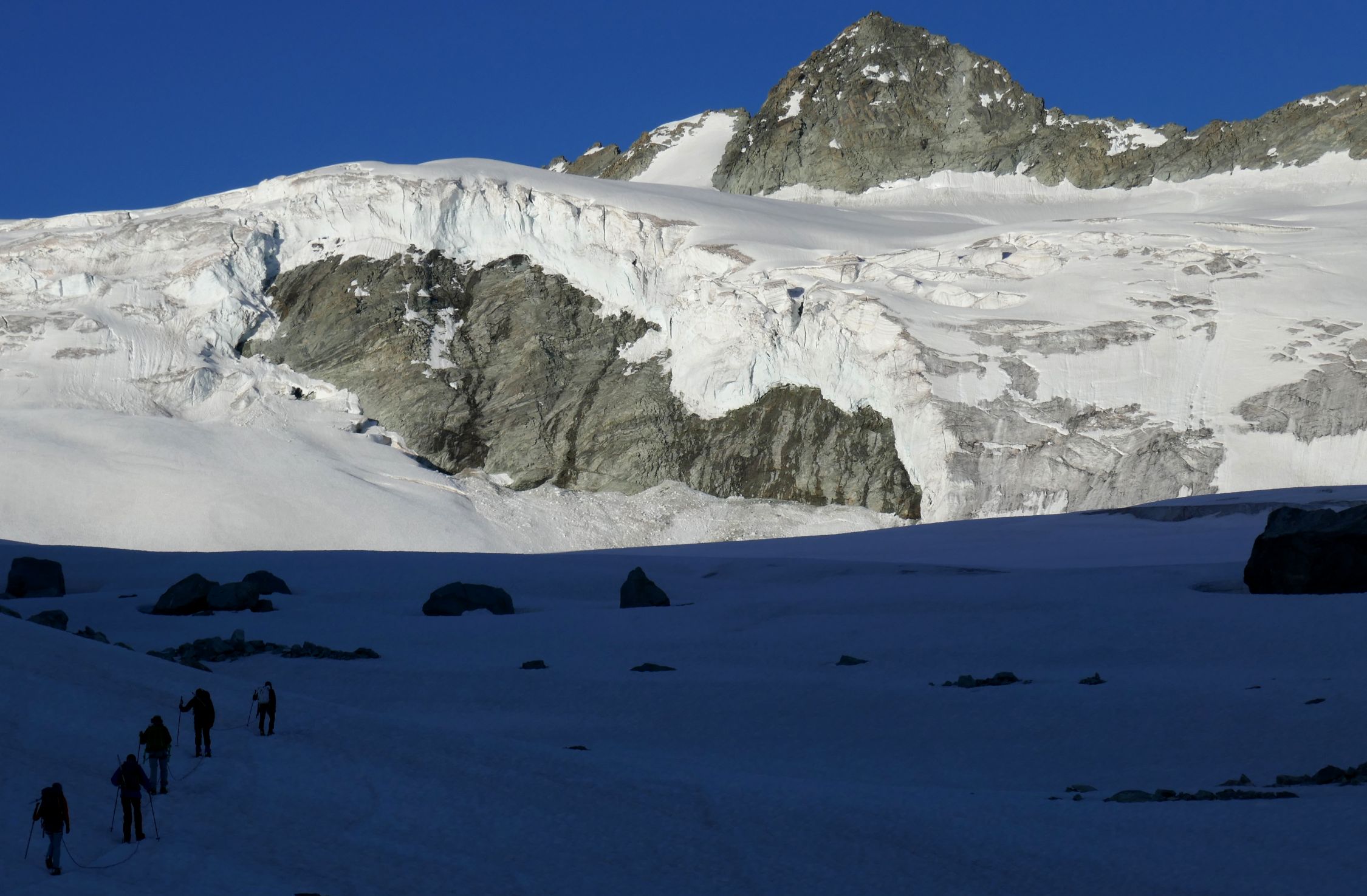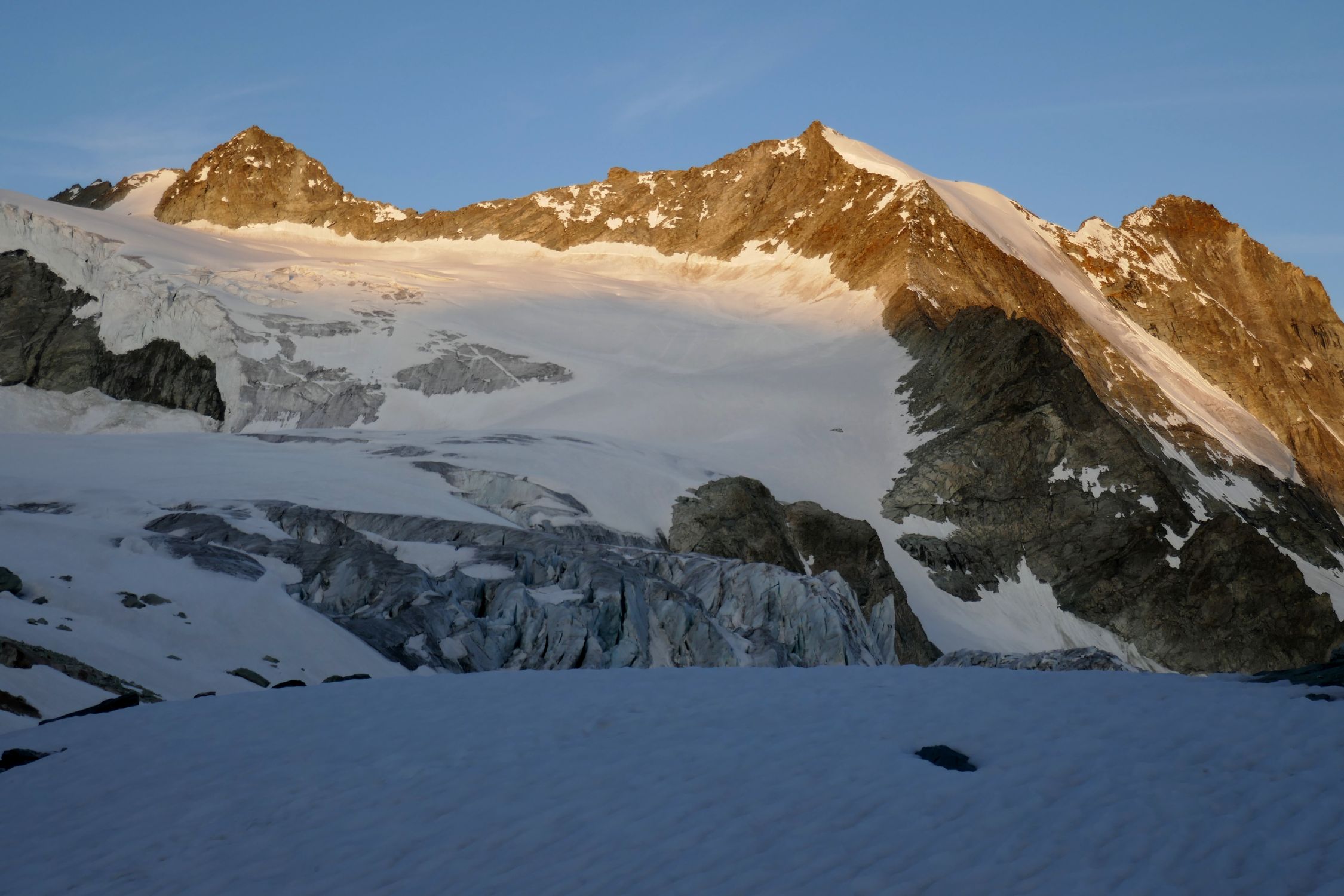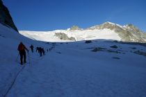 Der Gletscher ist noch gut eingeschneit und daher problemlos zu begehen. Am Abstieg wurde es logischerweise weicher, aber besser als erwartet kaum tief eingesunken. Nachts hatte es nicht gefroren.