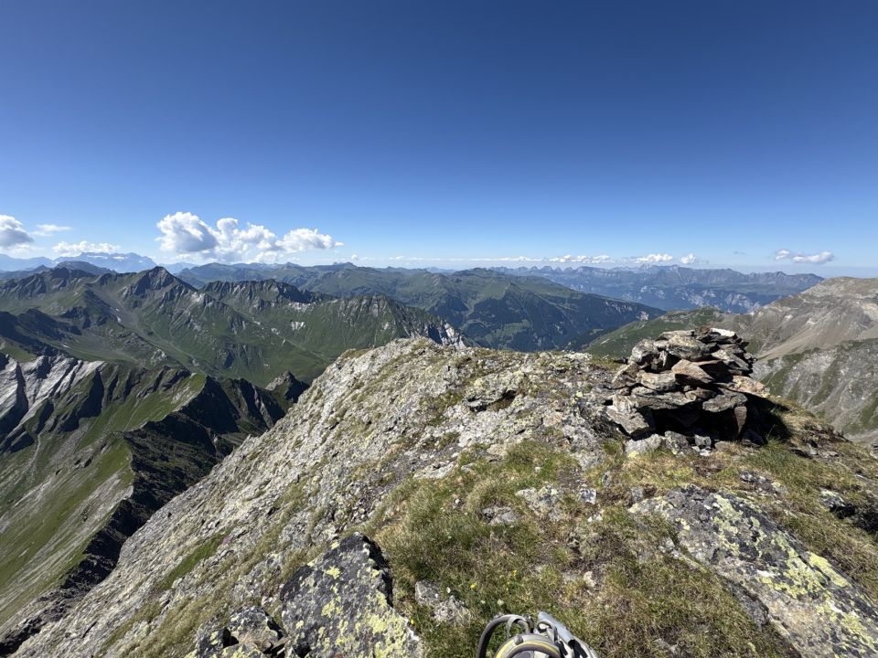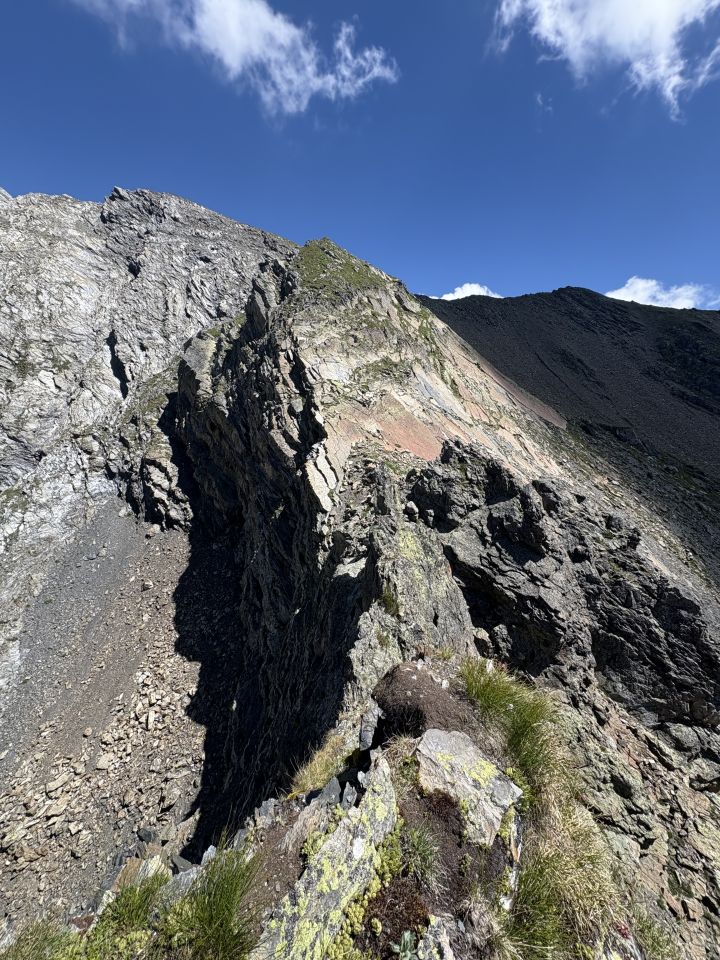 Heiss war es heute. Start mit ÖV vom Stausee Gigerwald. Danach der Strasse entlang nach St.Martin. Ab da hoch zur Alp-Säss mit der letzten Wasserstelle. Schon bald weglos durch das Ochsental und aufstieg zum Rotplättli. Am Grat bleibend schon bald felsiger und luftiger. Die drei scharfen Türmchen könnte man überklettern. Ich seilte mit 12m Südseitig ab. Danach durch und über Felsblöcke zum Südgrat. Den Rest am Grat entlang zum Südgipfel durch Schiffer und manchmal gutem Gestein. Ab klettern vom Südgipfel, um auf den Hauptgipfel zu kommen (T6).