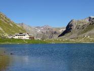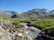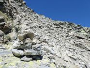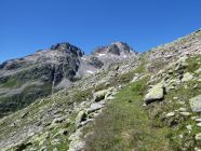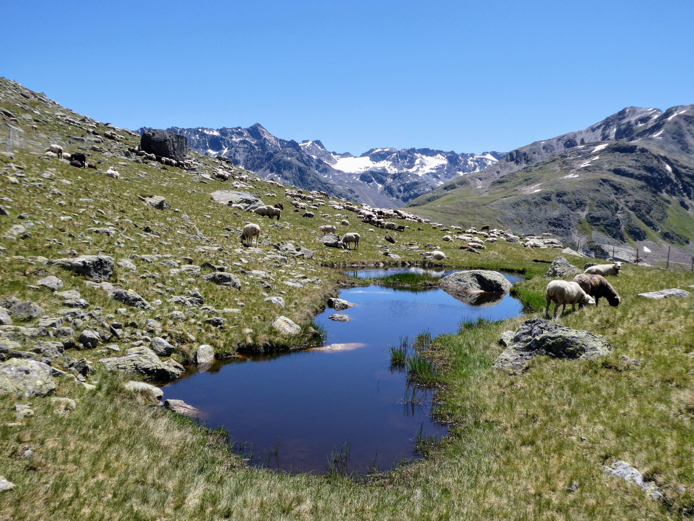Momentan weiden Schafe unter dem Piz Champatsch, weshalb ein Schafzaun aufgestellt wurde. Entweder umgeht man diesen oder man übersteigt ihn an geeigneter Stelle. "Offizielle" Herdenschutzhunde gibt es dort keine, aber die Schäferin besitzt einen Border Collie, der natürlich auch menschliche "Eindringlinge" meldet.