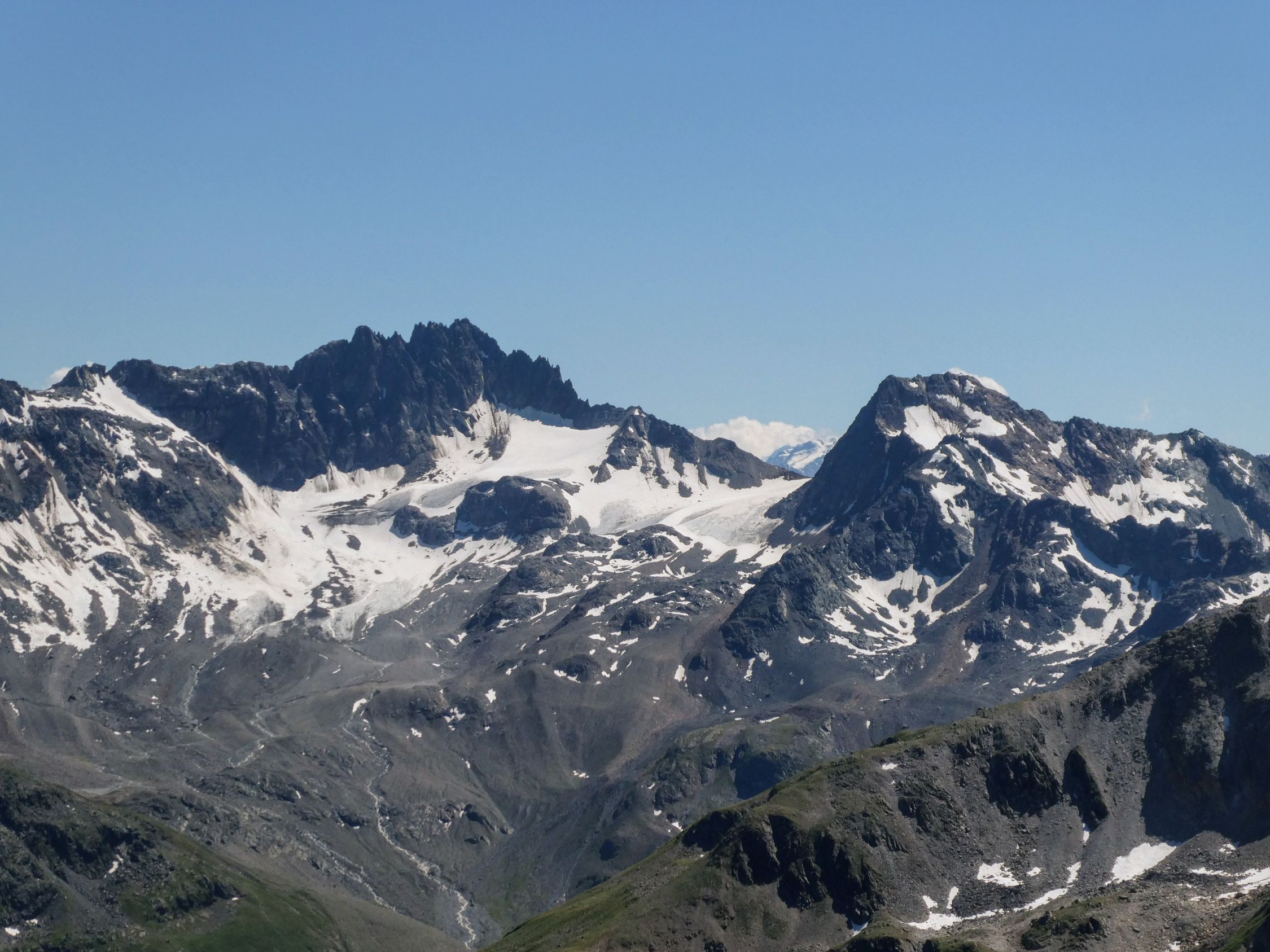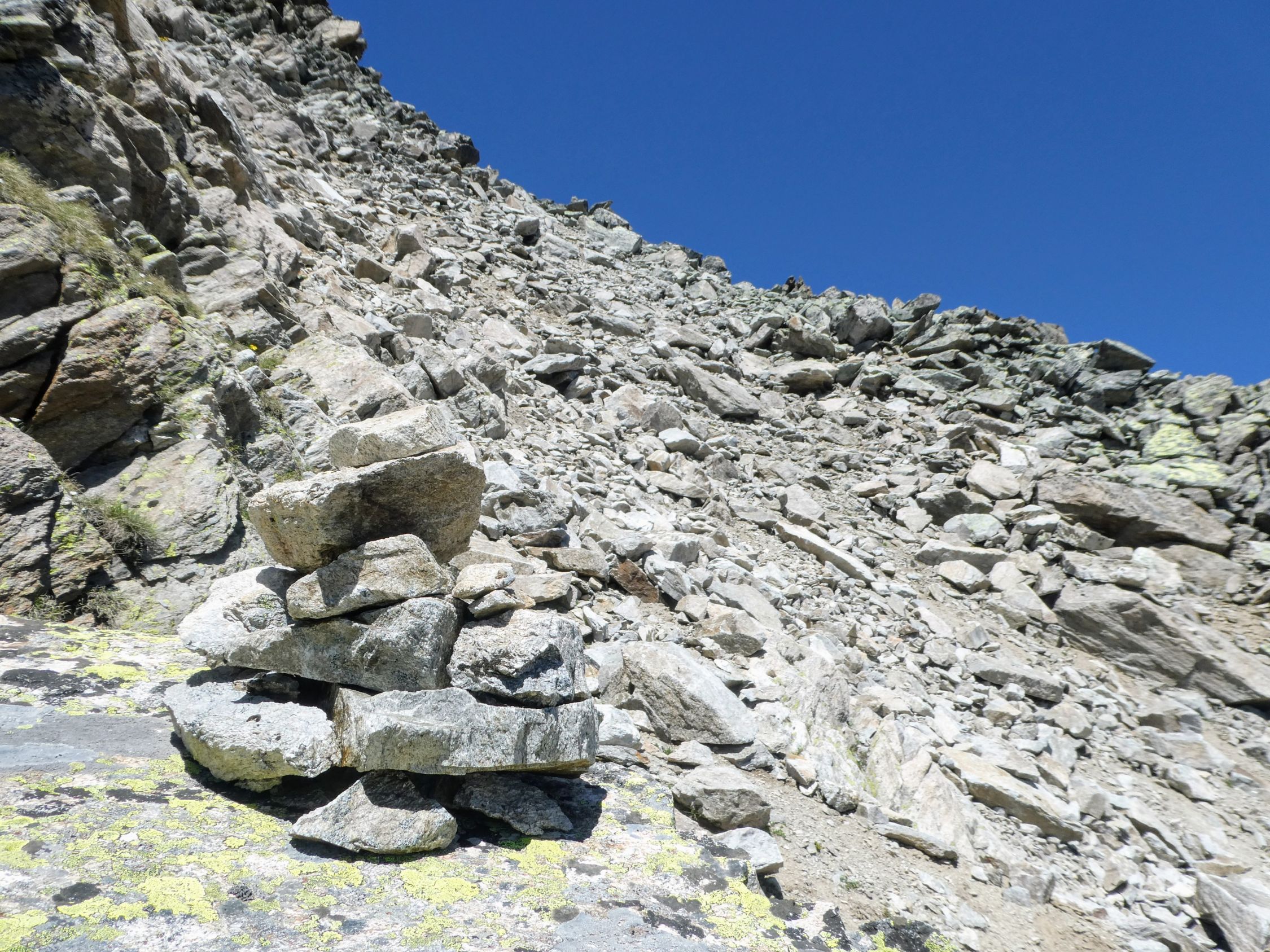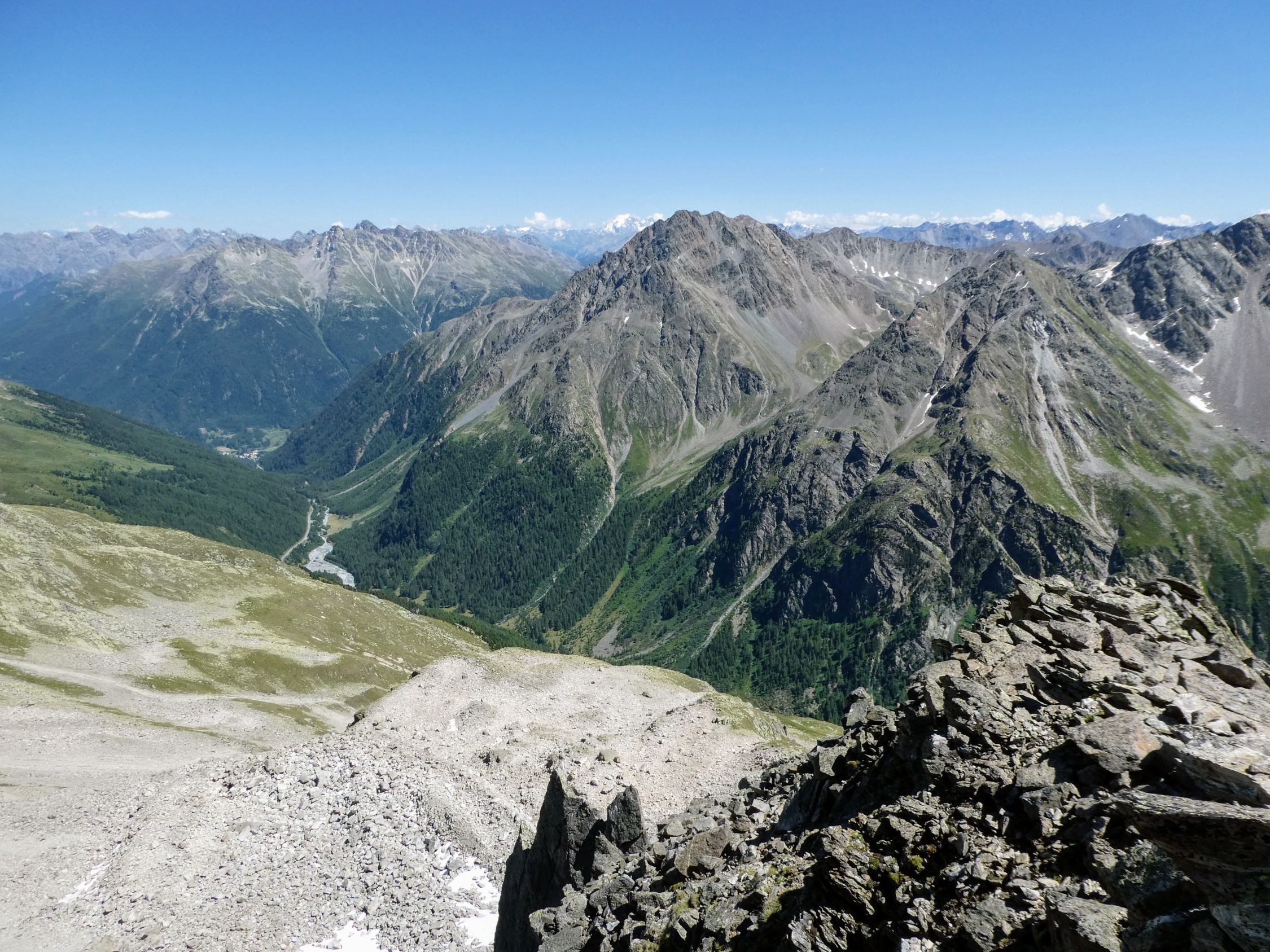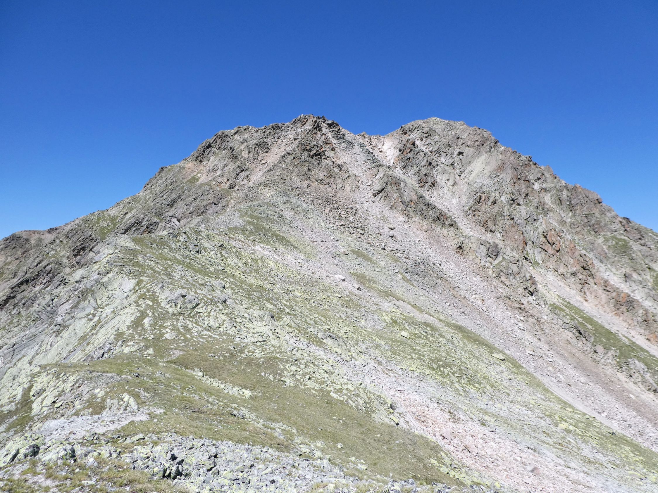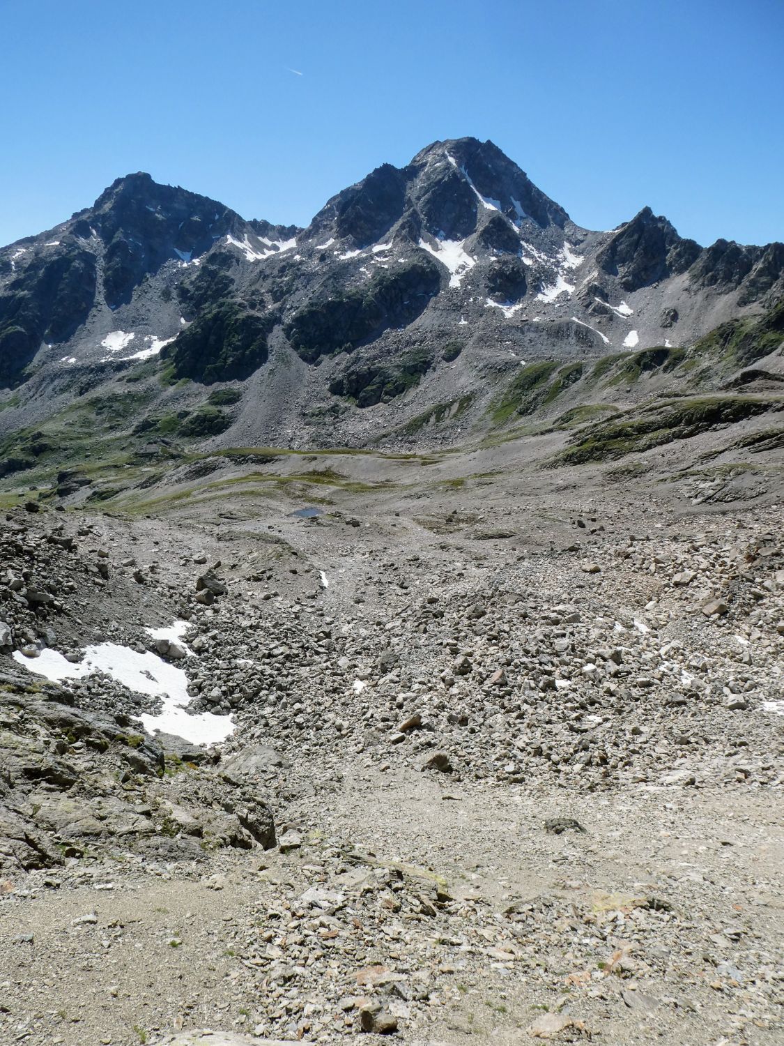 Ich stieg heute über die Normalroute (SAC-Führer Silvretta, Unterengadin, Münstertal, Route 340) auf den Gipfel (unten T3, oben T4) und wählte für den Abstieg eine breite Rinne nach Nordwesten, um über Tantermozza Chant Sura wieder zum Aufstiegsweg bei Pkt.2330 zu gelangen.