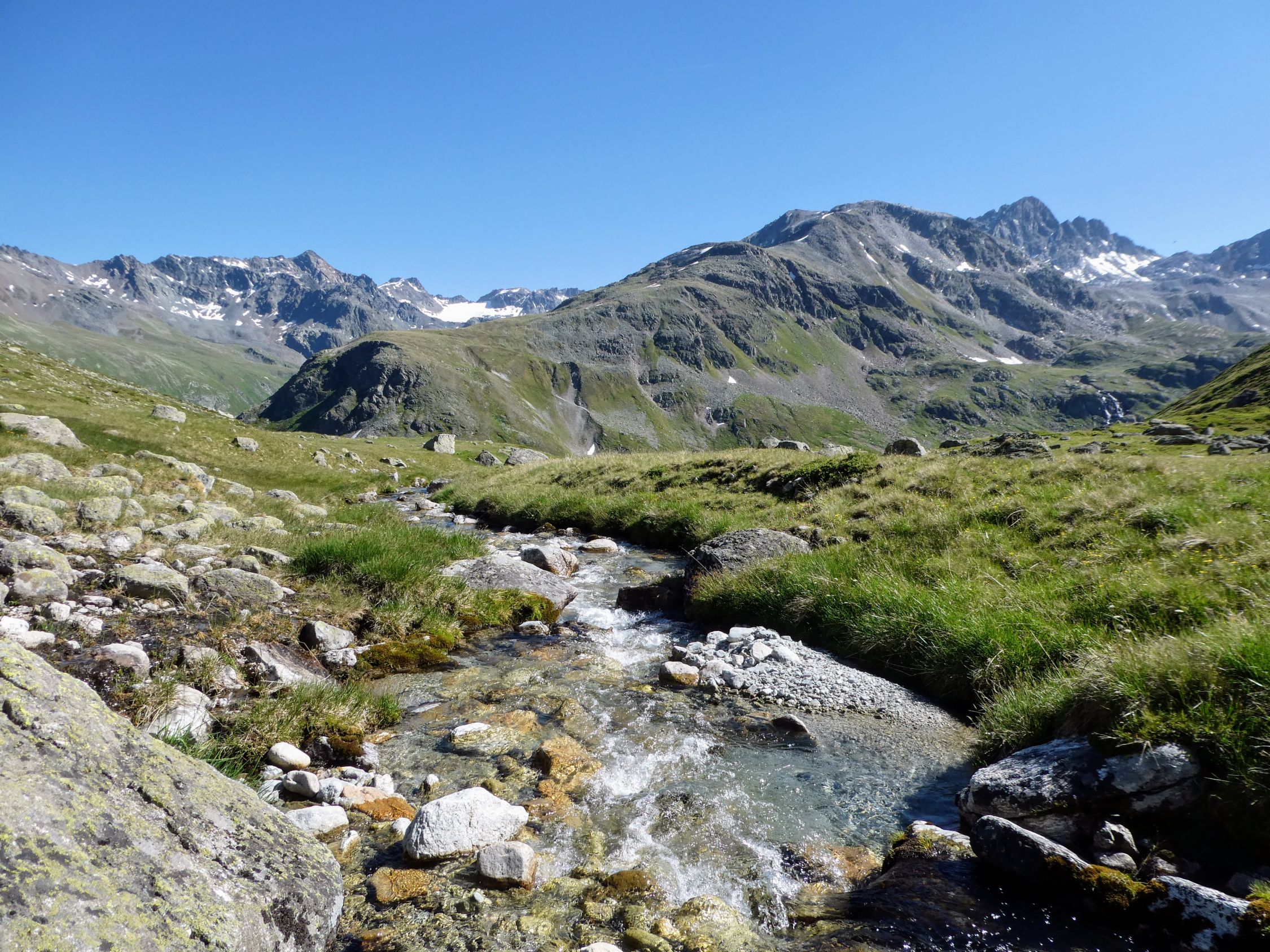 Nachmittagstour mit Start in Chant Sura an der Flüelapassstrasse (Postautohaltestelle und Parkplatz) um 13.30. Wetter: wolkenlos bei 19°.