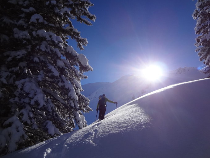 abfahrt über die grosse westflanke und durch eine waldschneise in den hinteren chirel. ab da dann mit etlichen stockeinsätzen zurück zum auto.