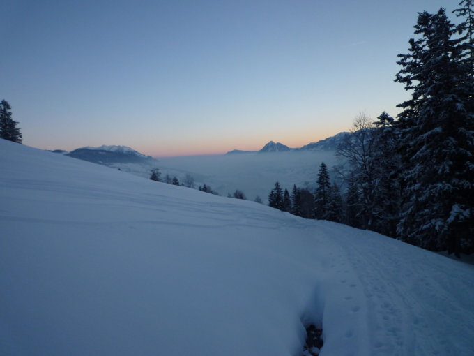 Gute Aufstiegsspur mit mehrheitlich noch gutem Powder, in Sonnenhängen schon etwas deckeliger.