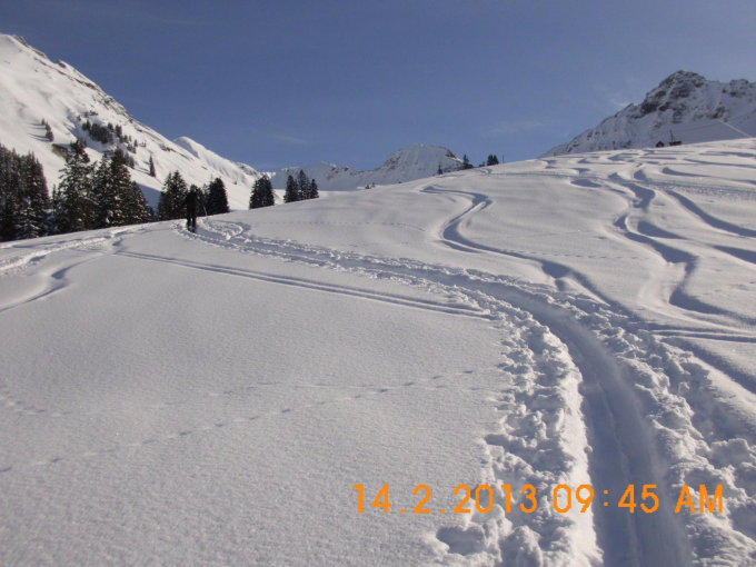 Schnee hat es wie in allen Bergregionen genug, durch die gestrige Sonneneinstrahlung und der nächtlichen Abstrahlung und kälte bildete sich zum teil einen dünnen Deckel, trotzdem recht gut fahrbar. Wetter am Vormittag sonnig, ab Mittag zunehmend bewölkt, auf dem Gipfel windstill...
