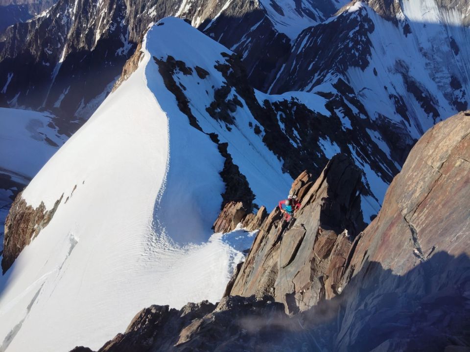 Extrem lange Überschreitung, erfordert sehr gute Kondition (900+2400+2200 hm) und stabiles Wetter, technisch aber nicht schwierig. Erste Nacht im Refuge de Tré la Tête, sehr empfehlenswert. Am zweiten Tag Miage-Überschreitung bis Refuge Durier, landschaftlich großartig und technisch eher leicht. Abstieg zur Durier ein Sandhaufen und unattraktiv, nicht schwierig, einmal 10 m abseilen, sonst seilfrei und ohne Steigeisen. Durier-Wirte sehr freundlich. Start um 5:30, in gut 3 Stunden auf die Aiguille de Bionnassay, Grat überwiegend Schnee, ca. 100 Hm leichte (IV-?) und wirklich schöne Felskletterei, Gipfel traumhaft mit Blick ins Flachland. Abstieg ins Joch über den fotogenen und gewohnt scharfen Grat, nicht absicherbar, daher Seil in den Rucksack gepackt. Ab Gonella-Abzweig „Autobahn“ bis Mont Blanc, am Gipfel Plusgrade. Abstieg ins Col de la Brenva gemütlich. Beim Abstieg vom Col du Maudit kamen bereits Steine daher, blieben aber im weichen Schnee stecken. Steilstelle mit Fixseil abgesichert, daher unproblematisch in 2 Minuten (wenn kein Stau) zu überwinden Dann schnell unter dem bereits in einem anderen Post erwähnten Serac durch. Abstieg vom Tacul am Nachmittag sehr weich, Spaltenbrücken instabil, vermutlich bald Leitern nötig. Nach Übernachtung in der Cosmique-Hütte noch den herrlichen Cosmiques-Grat angehängt. Alles komplett ohne Steigeisen.