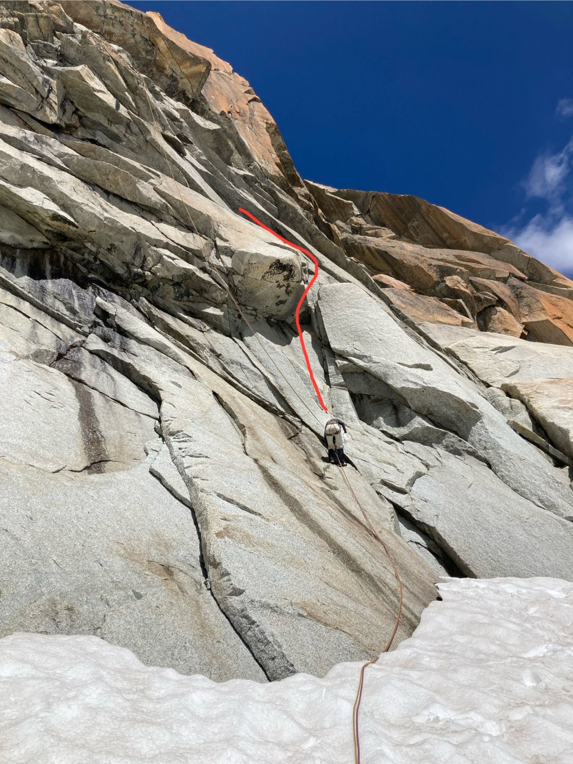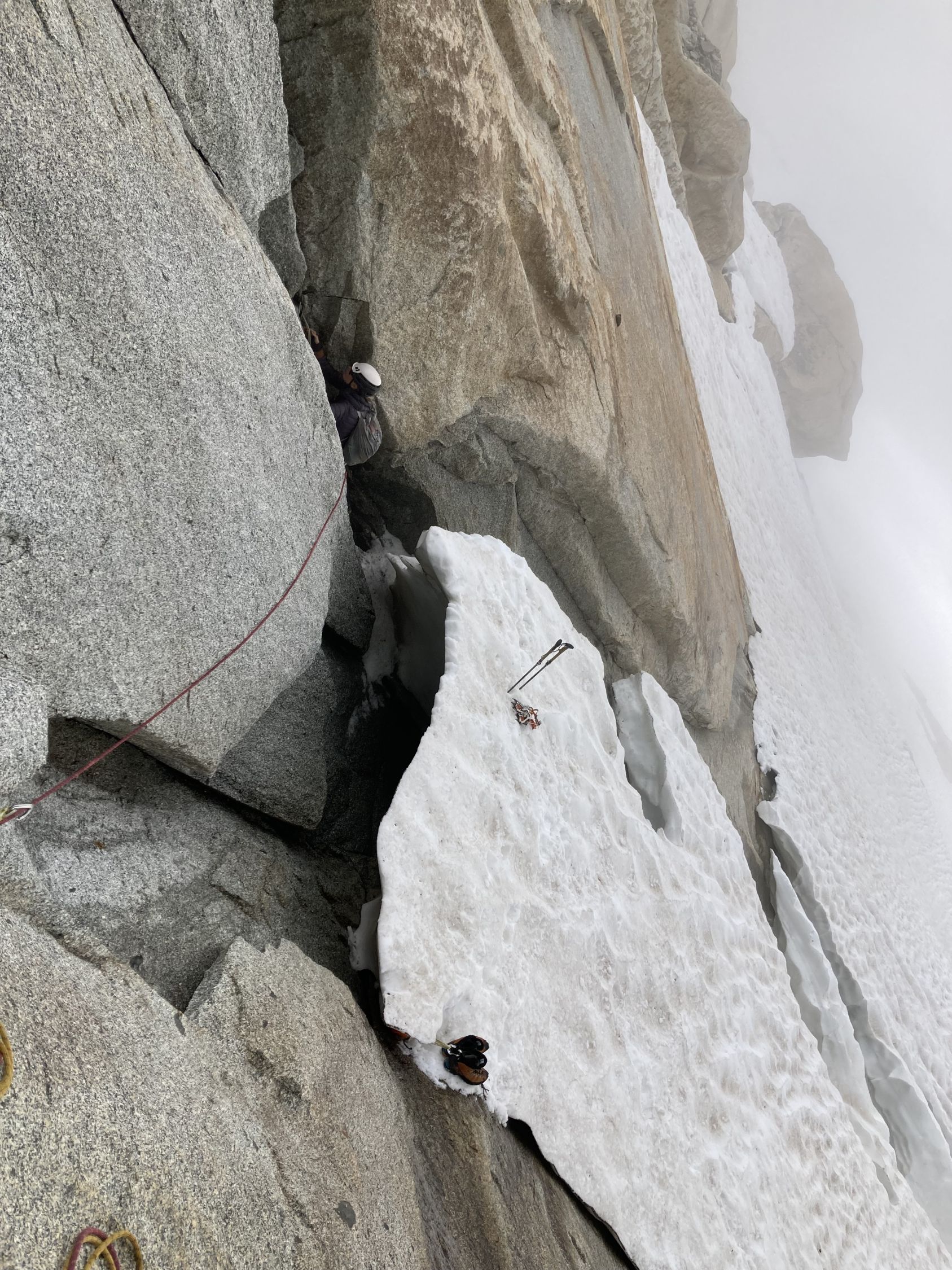 Haben quasi im Schrund, an Anfang der grossen Verschneidung, die vermutlich zum Originaleinstieg führt, einen Improstand gemacht (Kreuz auf dem Bild und da wo die Person mit dem weissen Helm auf dem anderen Foto steht) und von da aus gesichert. Der erste Haken, den wir anklettern konnte, ist linkerhand, ca. 6m oberhalb des Schnees (da wo die Person auf dem Foto steht). Diese Passage ist nicht sehr schwierig und kann mit Mikrofriends, 0.1, 0,2, 0,3 abgesichert werden.