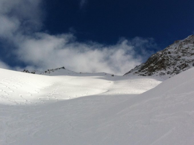 ca. 30 cm Pulver. Darunter eingeschneiter Deckel. Aber gut zu fahren. Hatte noch Platz für eigene Spuren, dieser ist nun aber langsam rar.