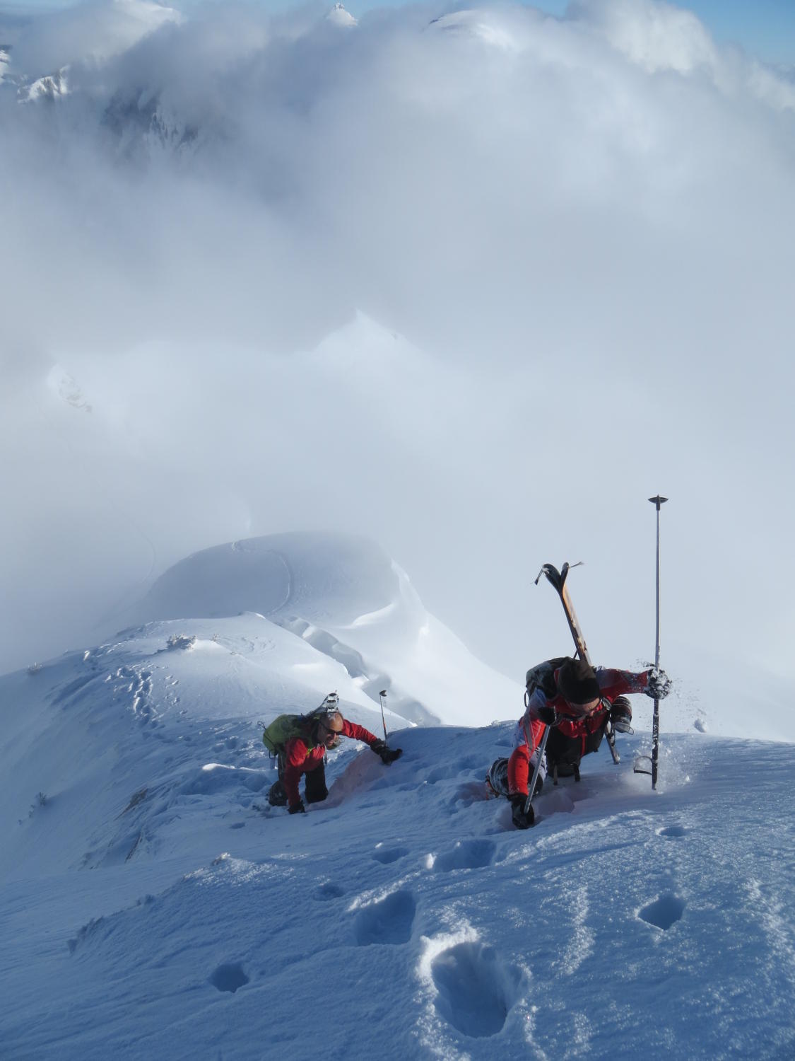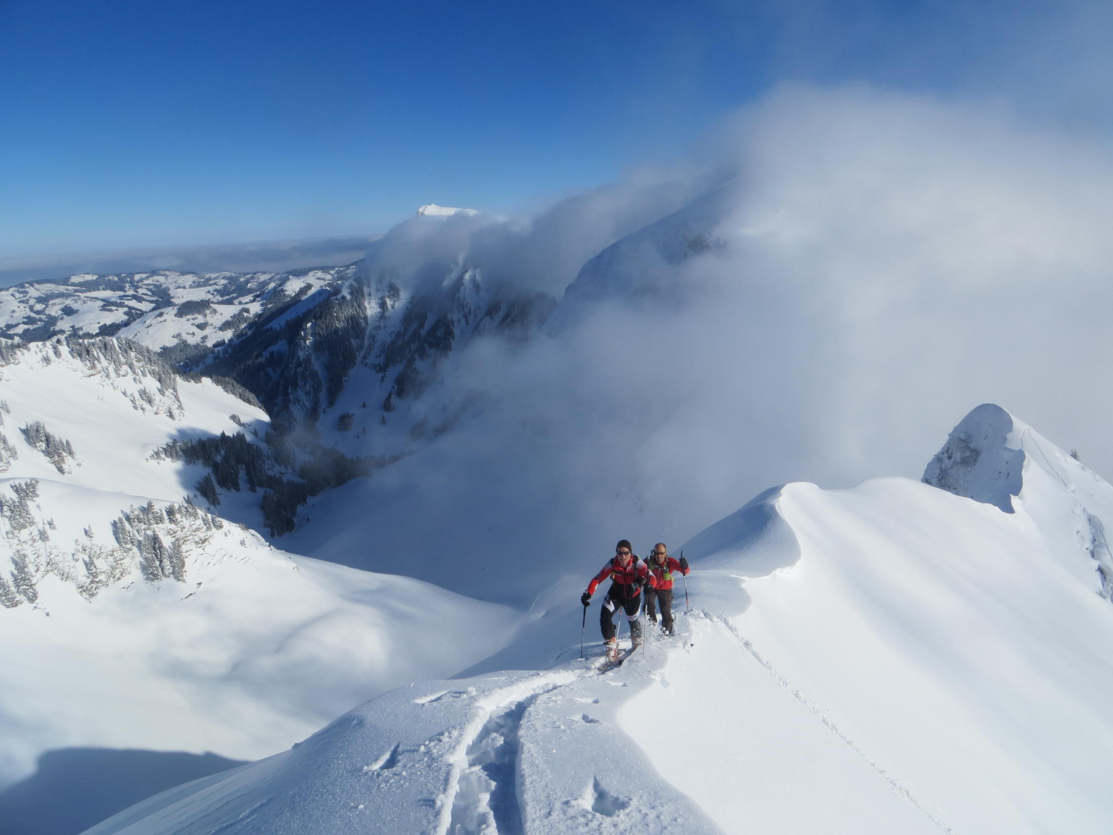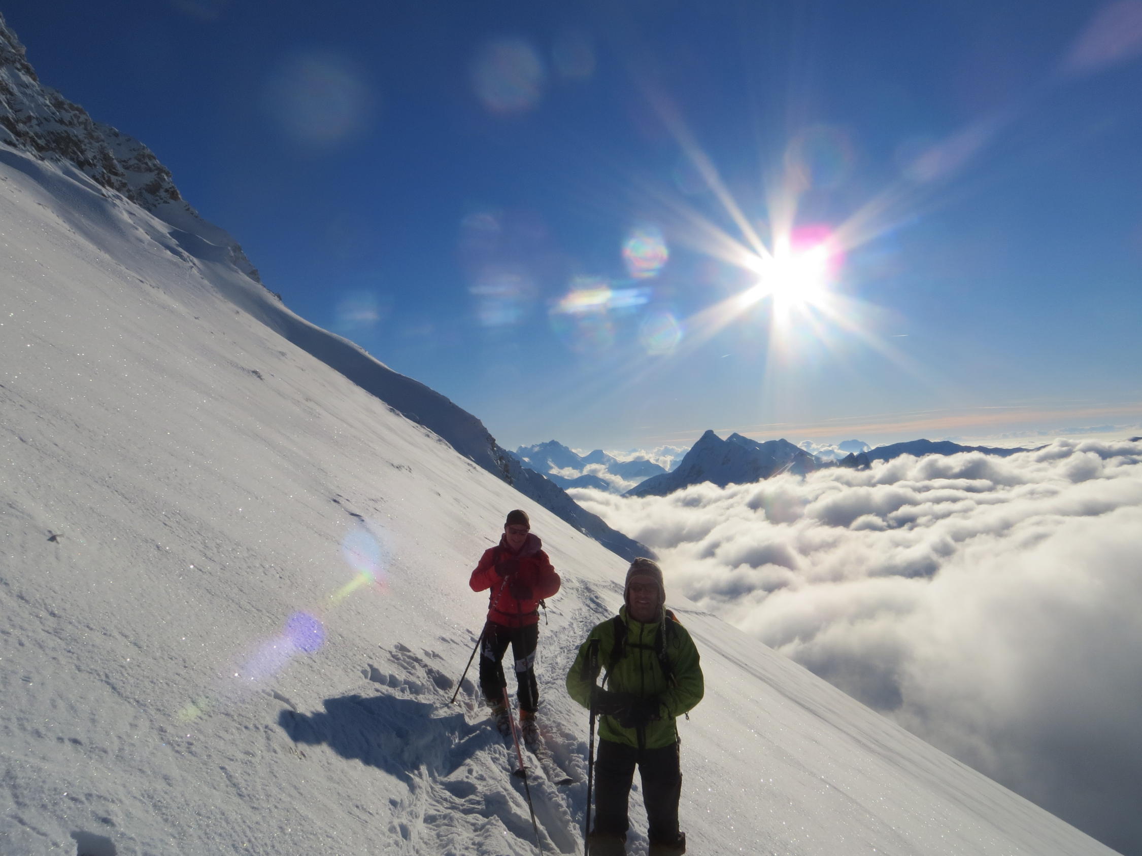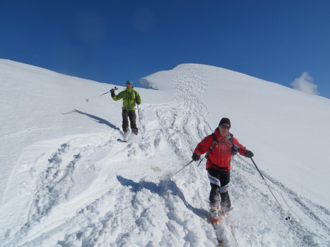 Abfahrt über NO-Couli zurück zu Chüerarnisch, Abfahrt W-Hang nach Walop, Abfahrt W-Hang ab Gipfel bis 1600m, Abfahrt N-Hang zurück in den Muscherenschlund.