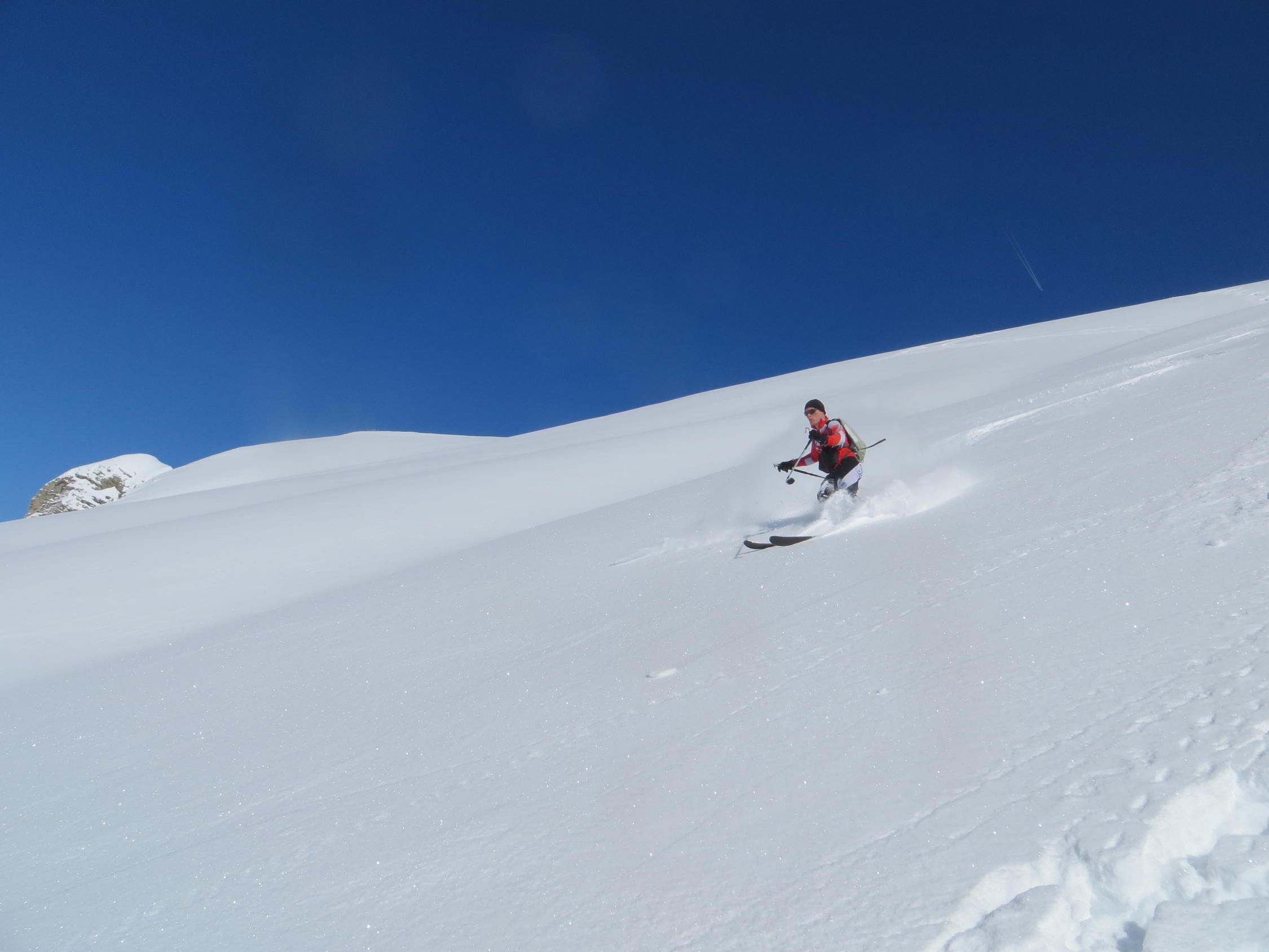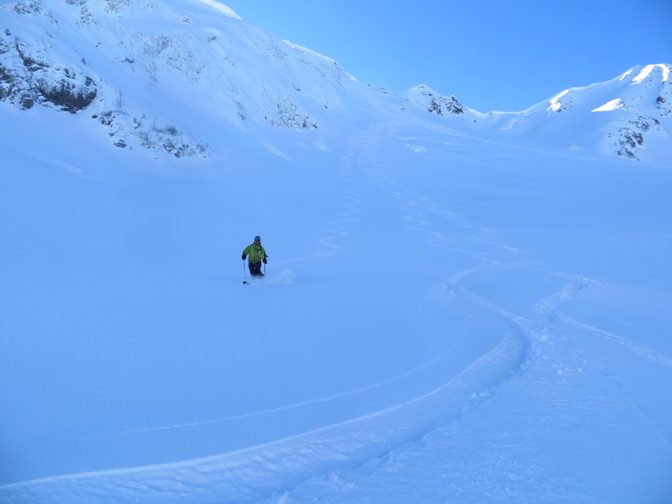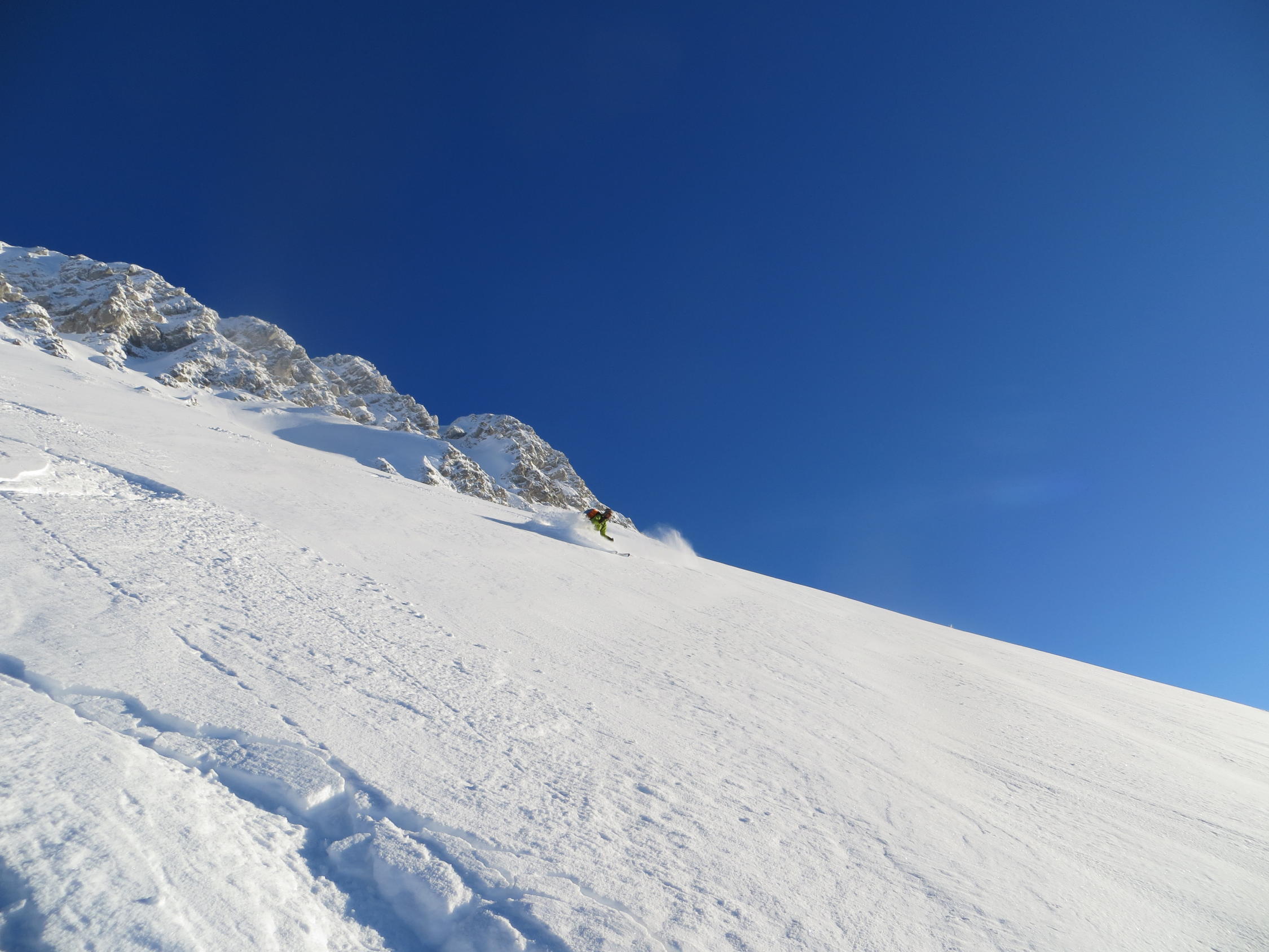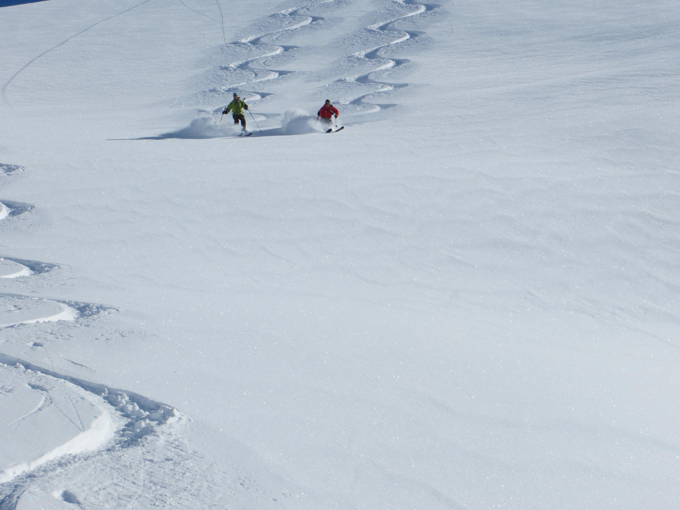 Unverspurter Pulver à discrétion überall... Sehr wenig Windeinfluss auf die Schneedecke, daher sehr inkl. sehr steiles Gelände angenehm zu riden!