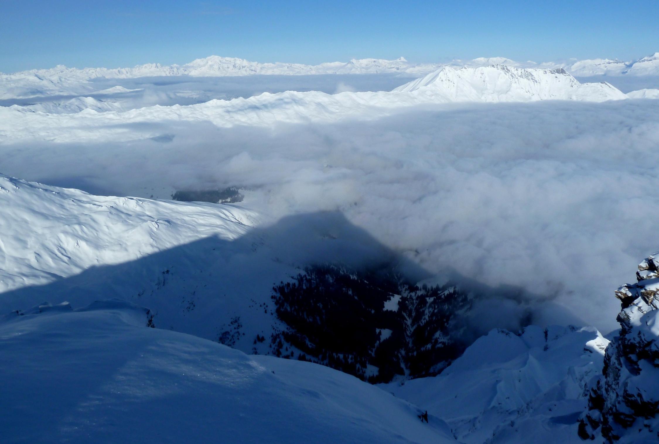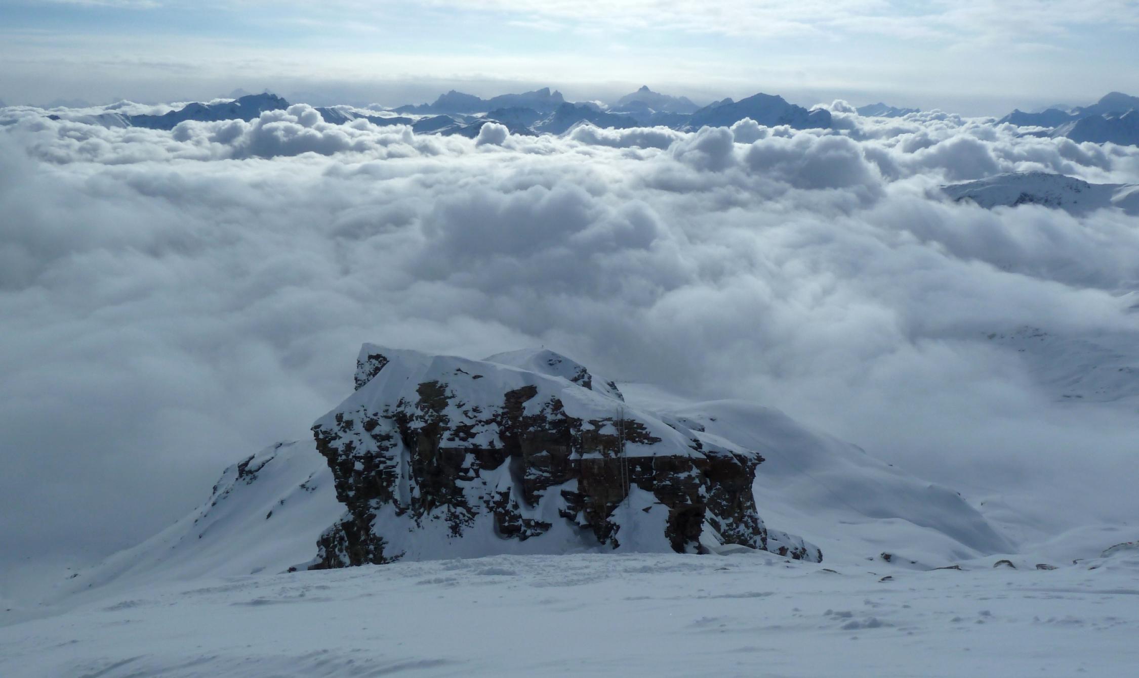 Start der Tour bei Nebel und Schneefall. Erst unterhalb des Beverin Pintg (2587 m)haben sich die Wolken gelichtet. Was nachher folgte, war der absolute Hammer: Der blaue Himmel über und ein riesiges Nebelmeer unter mir. Auf dem Gipfel war es mit Bise sehr kalt. Die Schneeverhältnisse waren ebenfalls gut. Oben wie immer verblasen, aber gut eingeschneit. Auf der Variantenabfahrt vom Leiterfuss hinunter zur Alp digl Oberst waren auch noch unverspurte Hangabschnitte zu finden. Weiter unten trugen die Sonnenhänge bereits einen feinen Harschdeckel.