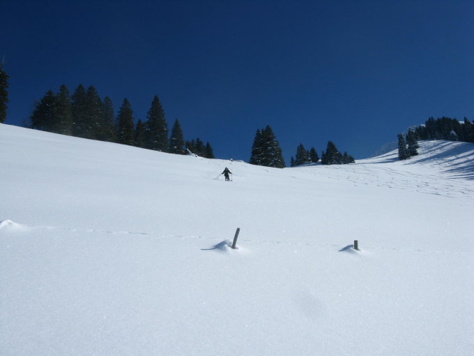 westflanke gegen oben zunehmend gedeckelt, in der abfahrt südliche seite gewählt, da pulver bis unten. vom chummli bis runter,becherkristallschnee vom feinsten...