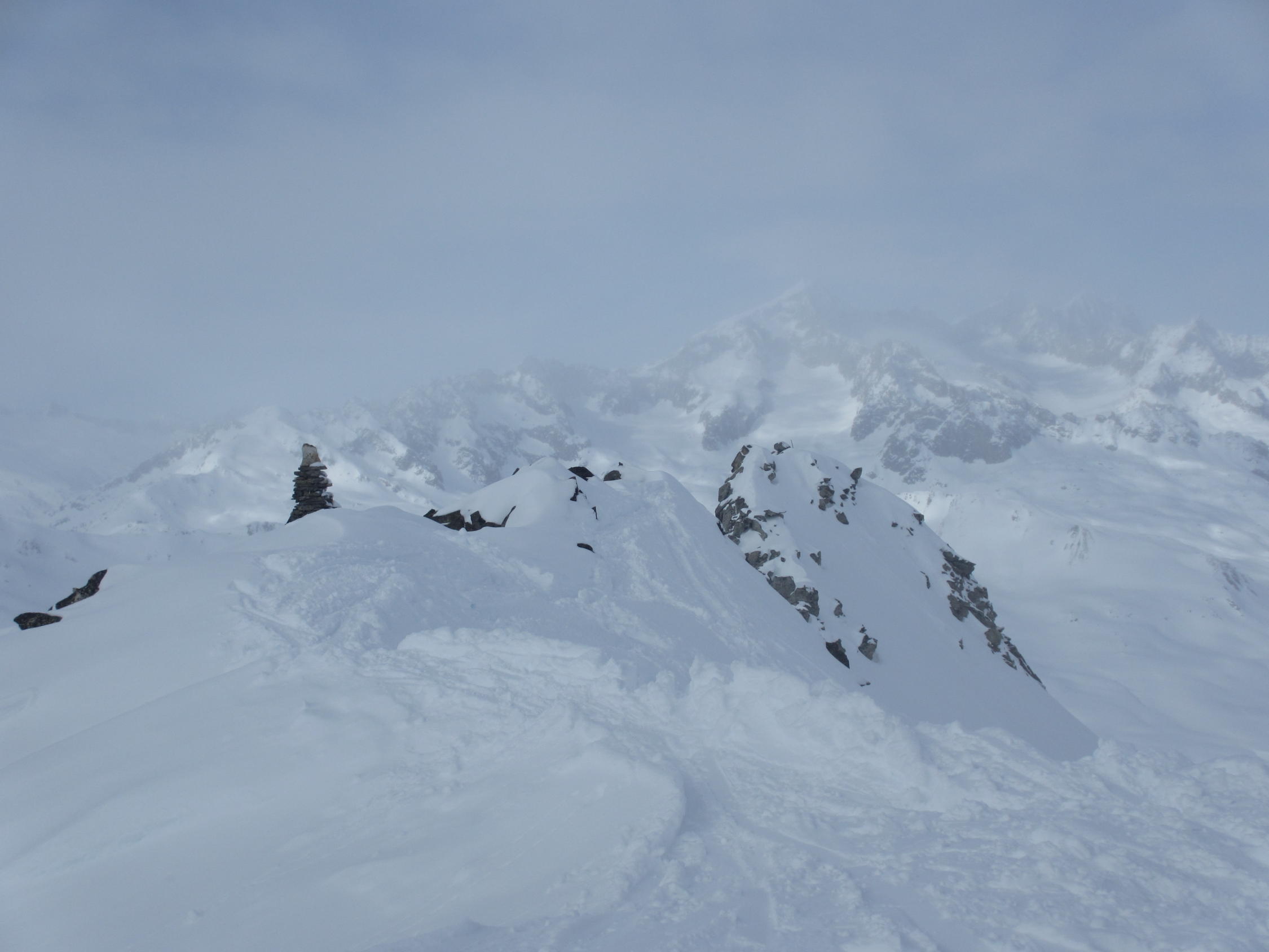 Gipfelgrat Trittschnee, geht gut ohne Steigeisen.