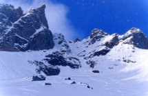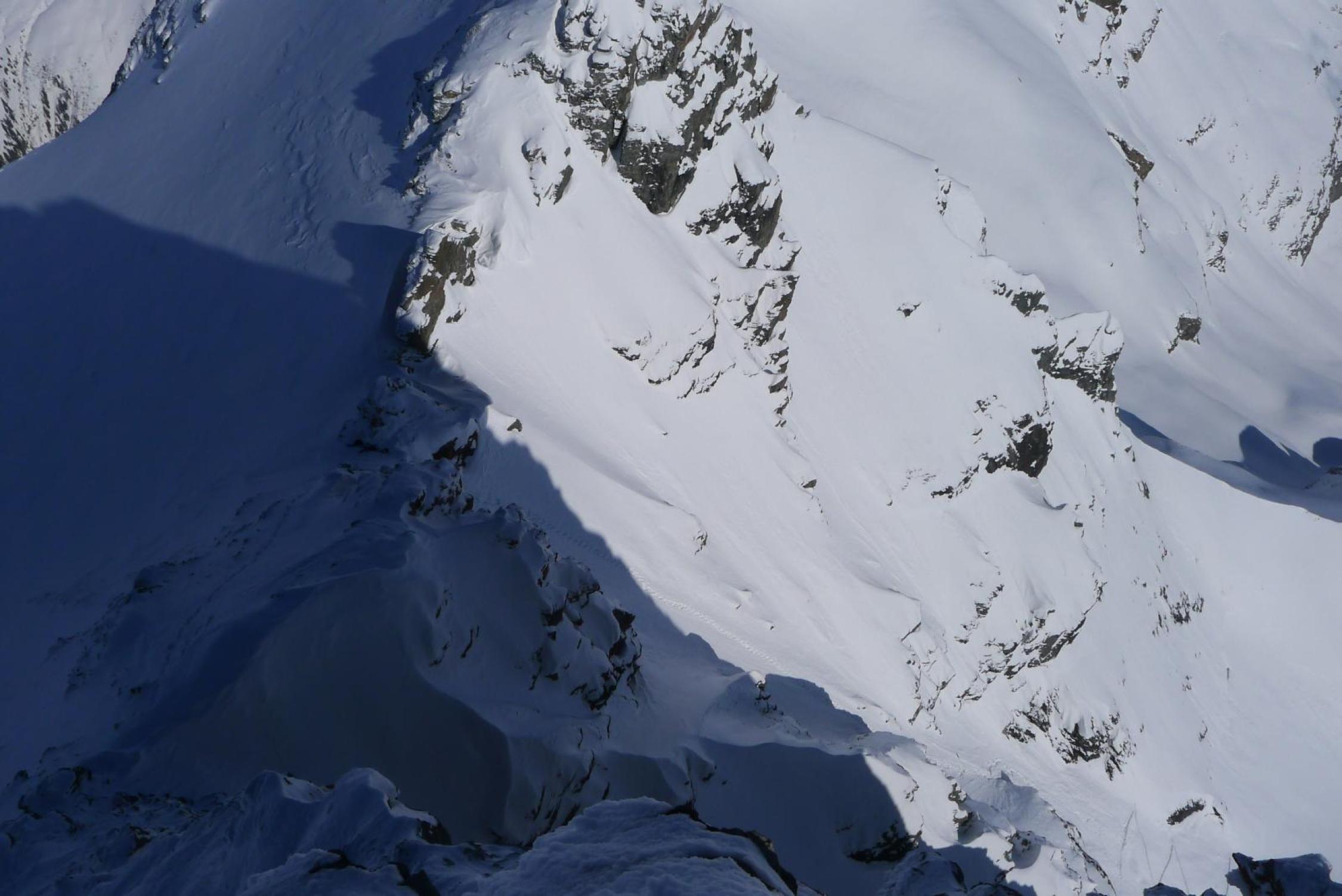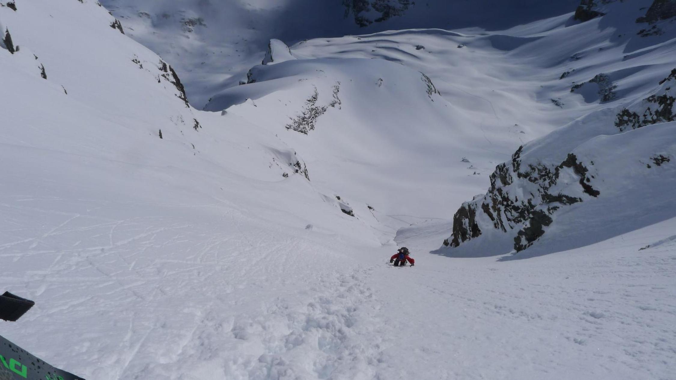 Schnee bindet südseitig gut mit der Sonne, trotzdem pulvrig. Optimale verhältnisse in Couloir.