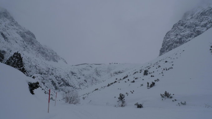 15-20 cm Traumpulver auf harter Unterlage: in der Abfahrt super, im Aufstieg aber an den drei Steilstellen rutschig (Lockerschnee gleitet ab). Deshalb 50 Hm am Bösen Tritt sowie 20 Hm unterhalb der Gipfelwächte zu Fuß, Steigeisen und Pickel sind aber nicht notwendig.