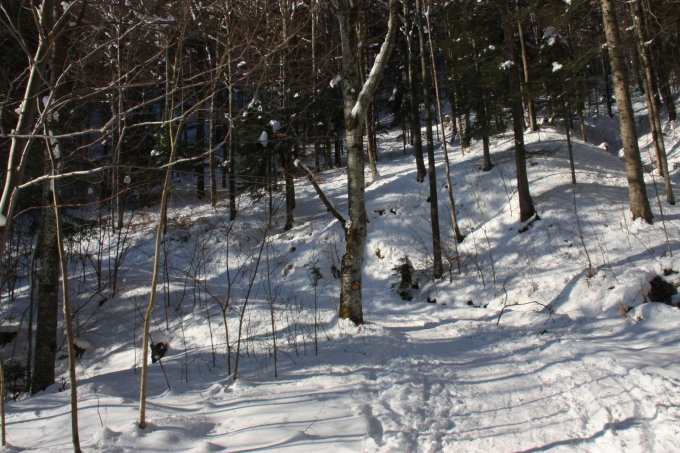 Ab Oberdorf müssen die Skier bis Weberhüsli getragen werden. Auf der Hasenmatt bereits apere Stellen vorhanden.