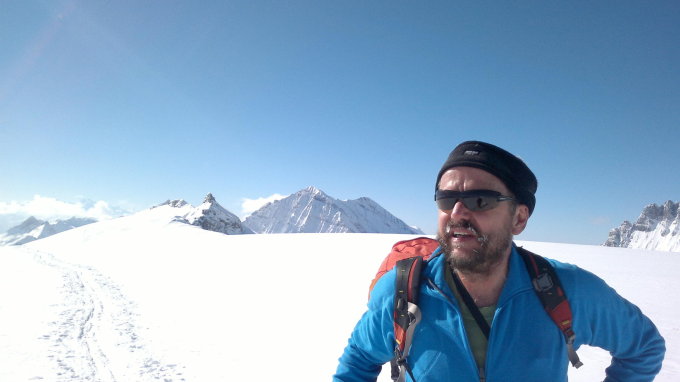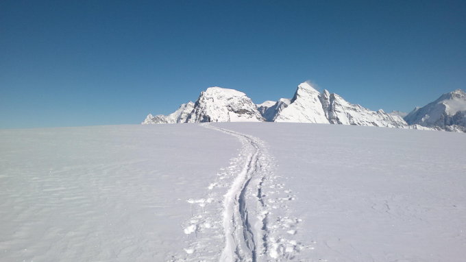 Abfahrt im Skigebiet bis auf 2724 m. Aufstieg auf gut gelegter Spur zur Tennubachlicka, weiter zum Elwertätsch auf 3210 m. Diesen Gipfel kann man mitnehmen. Währed weiteren 6 km läuft man zwischen 3000 und 3200 hm bis zum Petersgrat. In der Sonne, immer mit Blick aufs Bietschhorn, auf die Lötschenlücke. Wahnsinnig schön. Allen Alpinisten unter 90 möchte ich diesen Zustieg empfehlen und nicht die Anfahrt mit dem Heli. Er ist es wert.