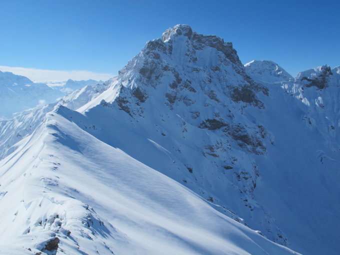Durchgehend Pulverschnee ausser erste 20m im Gipfelbereich bei der Querung nach links (südwärts)