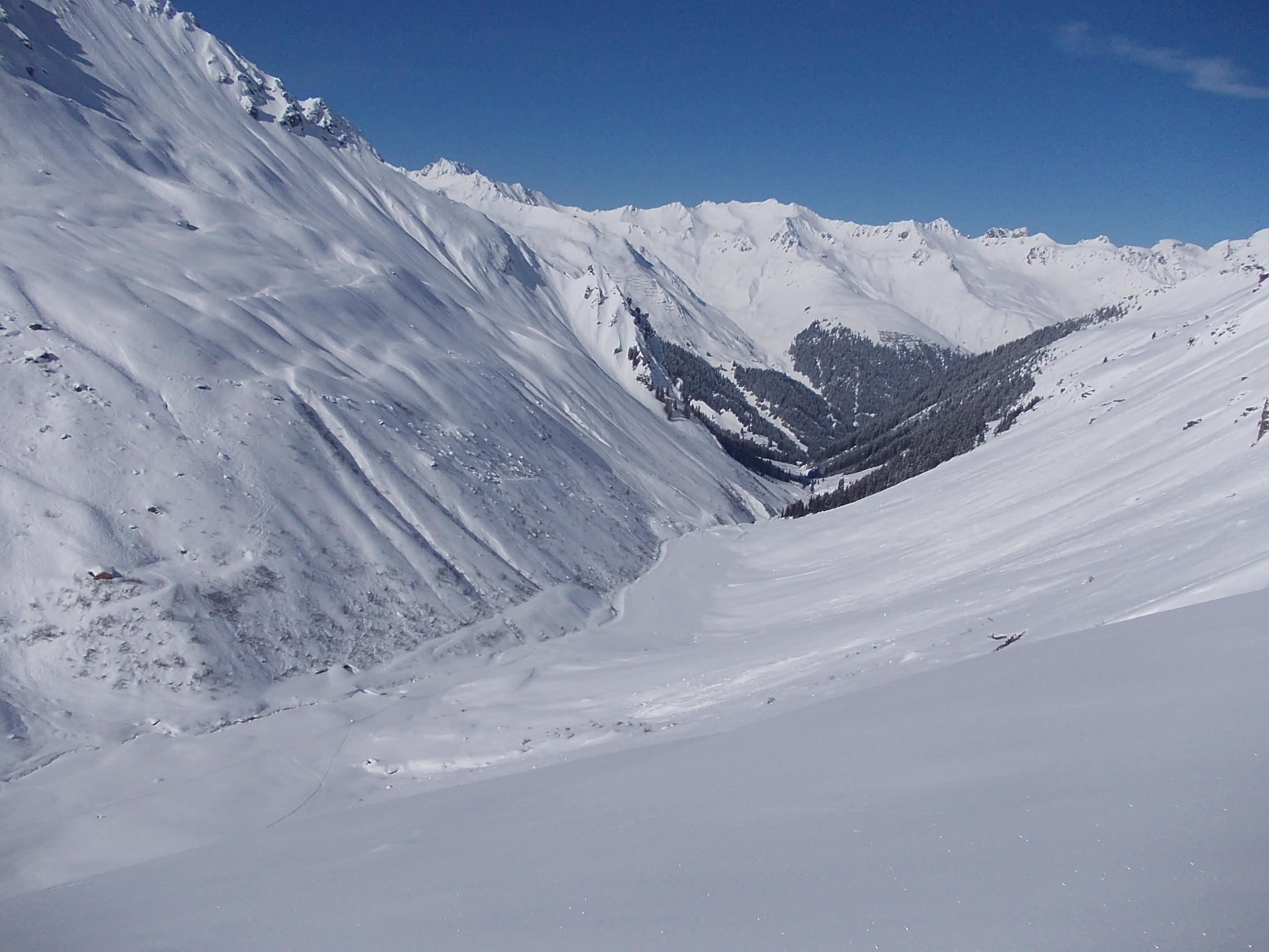 Nach Neuschnee oder Erwärmung unbedingt neu beurteilen. Insbesondere die Steilhänge oberhalb der Vergaldner Alp fordern sichere Verhältnisse.