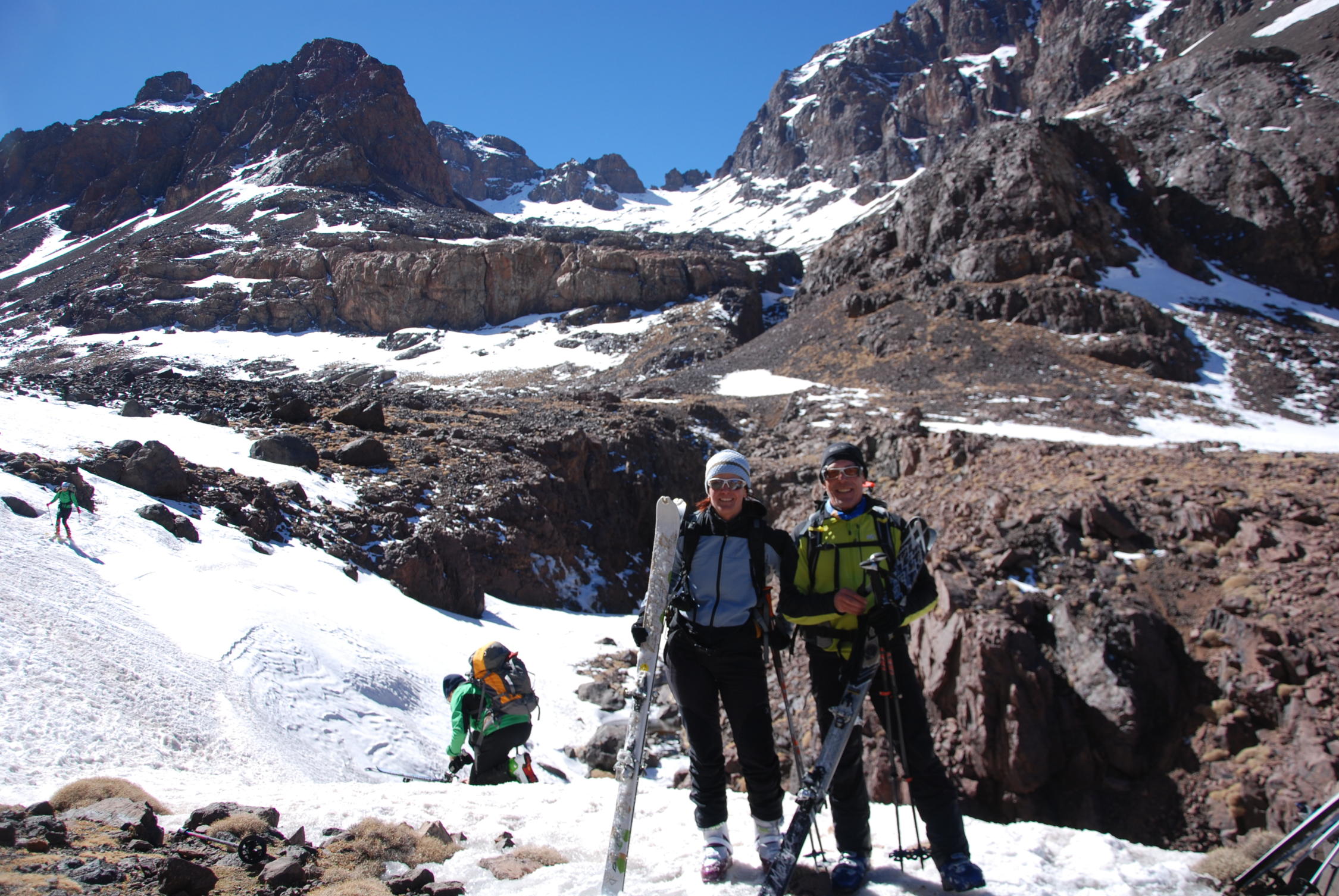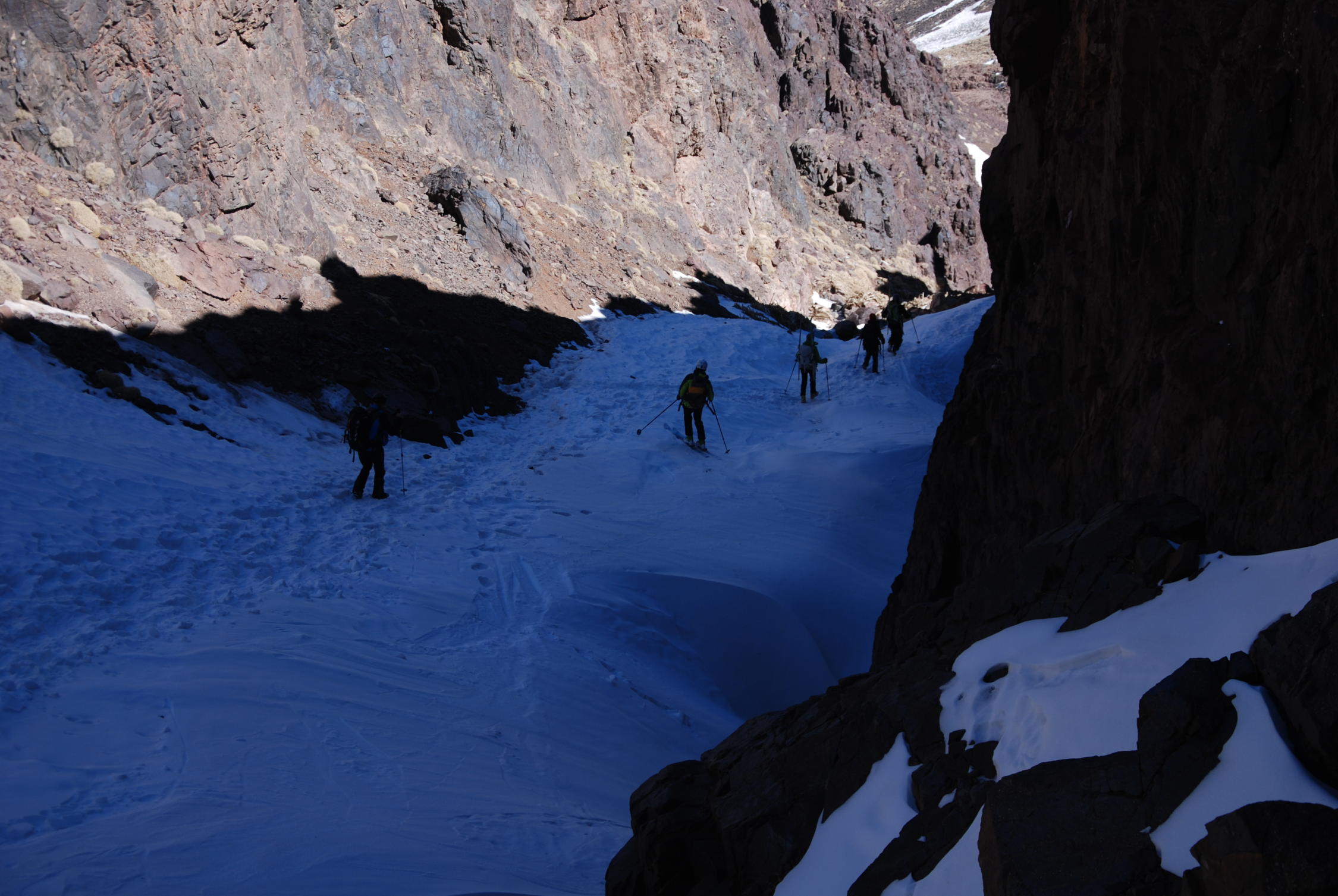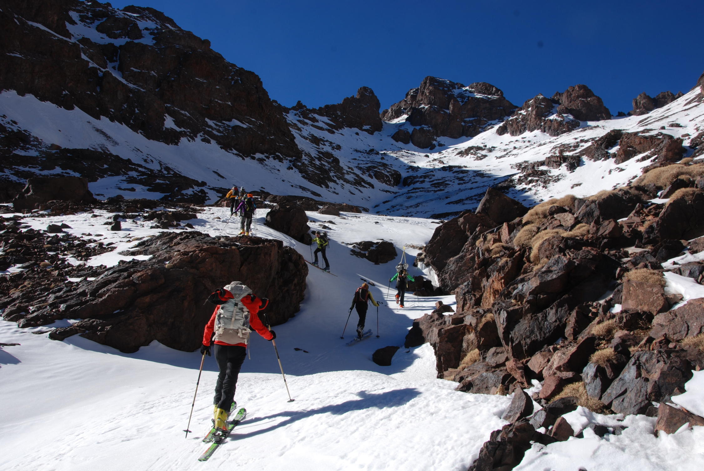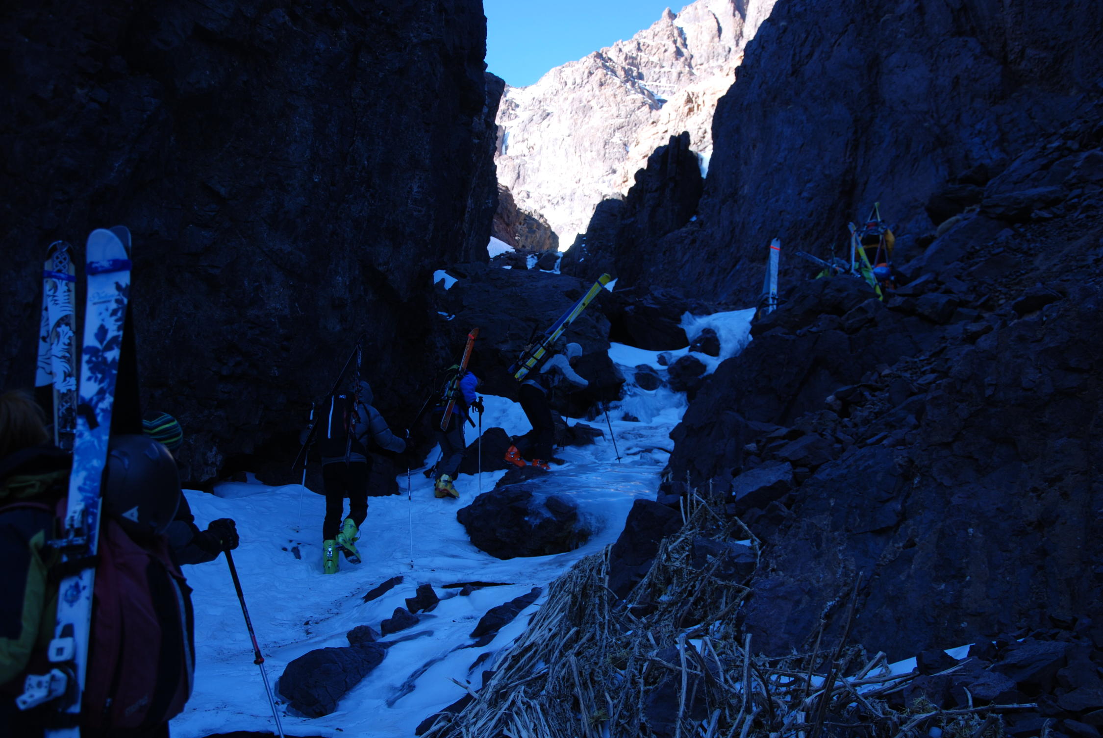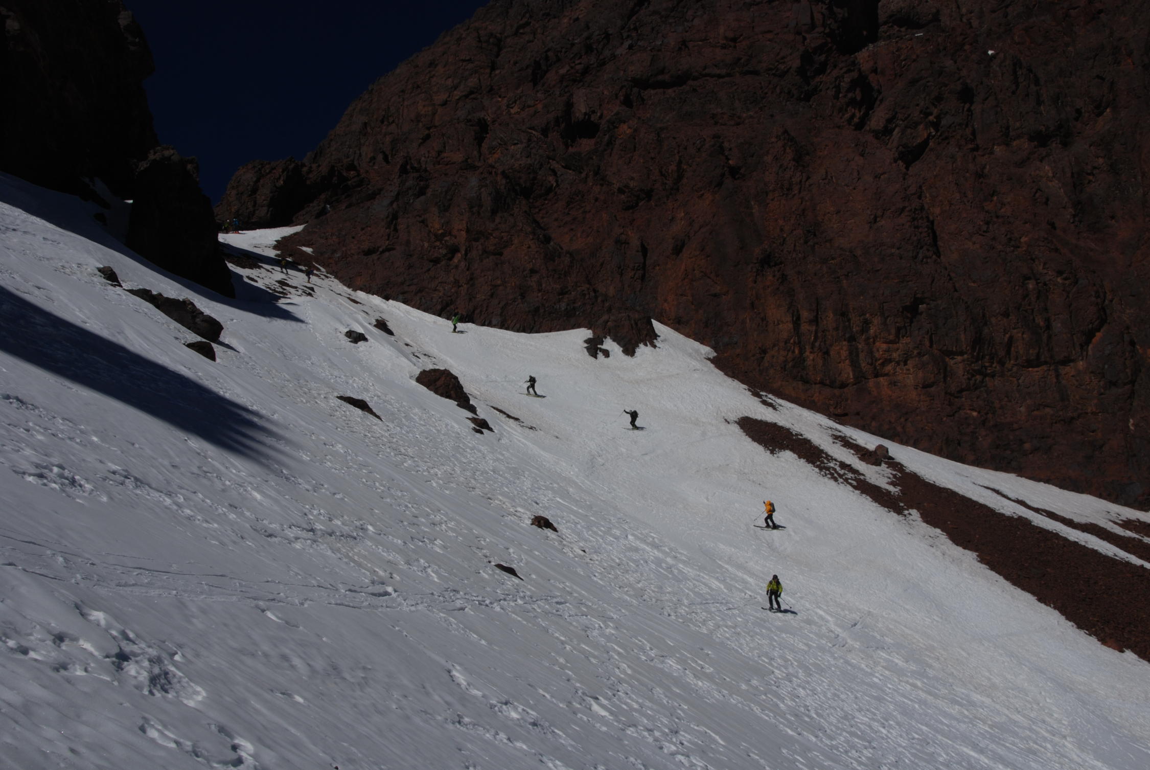 Ostanstieg Von der Toupkal Hütte geht es ca 45min gegen den Tizi N´Nouagane Pass hinauf und dann rechts in eine kleine Schlucht. Über kleine Eisfälle erreicht man nach weitere 30min einen offenen Kessel. Dort konnten wir die Schi anschnallen. Über mäßig steile Hänge geht es zu einem Plateau. Nach diesem in söstliche richtung über einen steilen Hang und zum Schluss einer Rinne gleichend zum Pass hinauf. Weiters kann man nur mehr zu Fuß den Gipfel erreichen.Abfahrt wie Aufstieg.