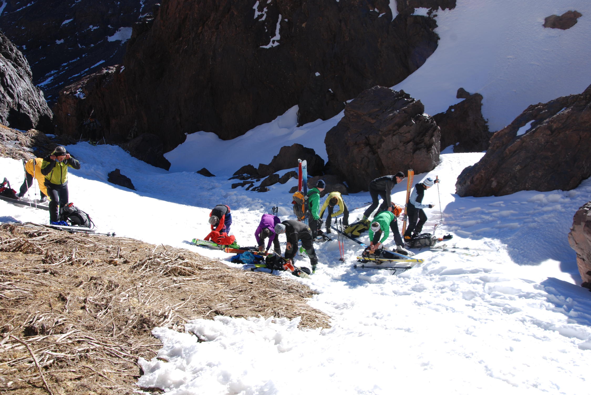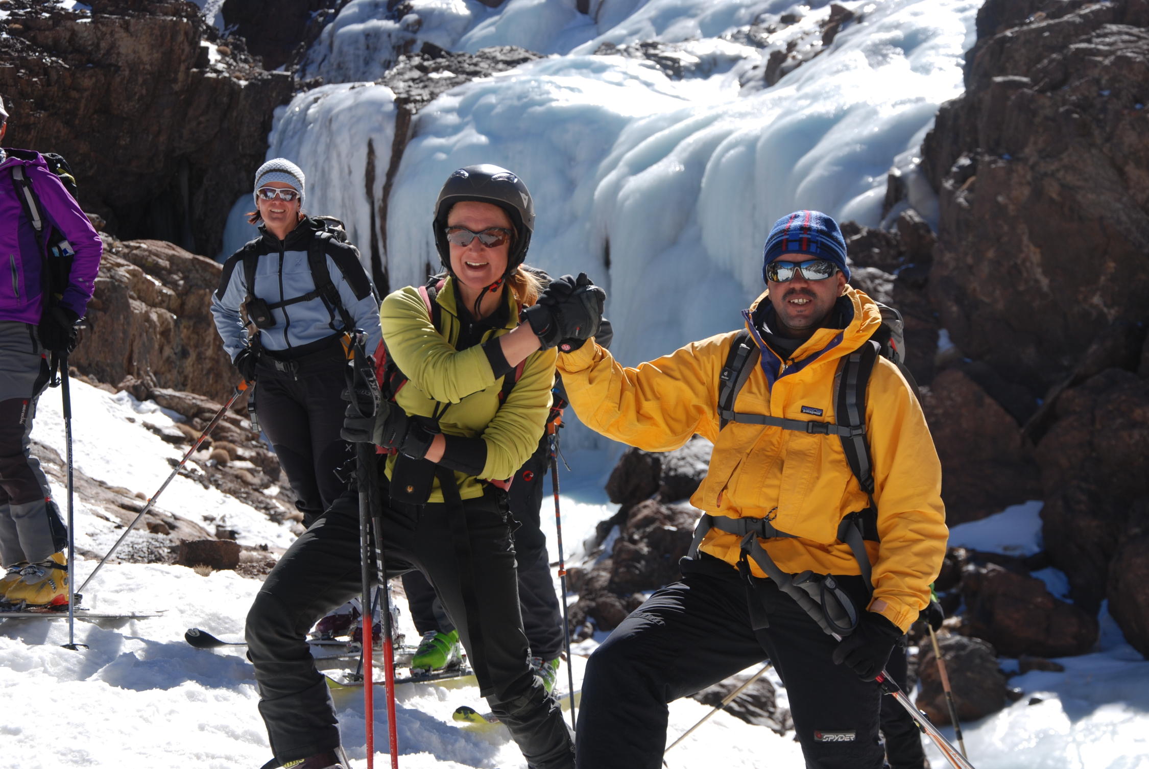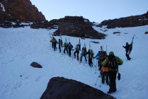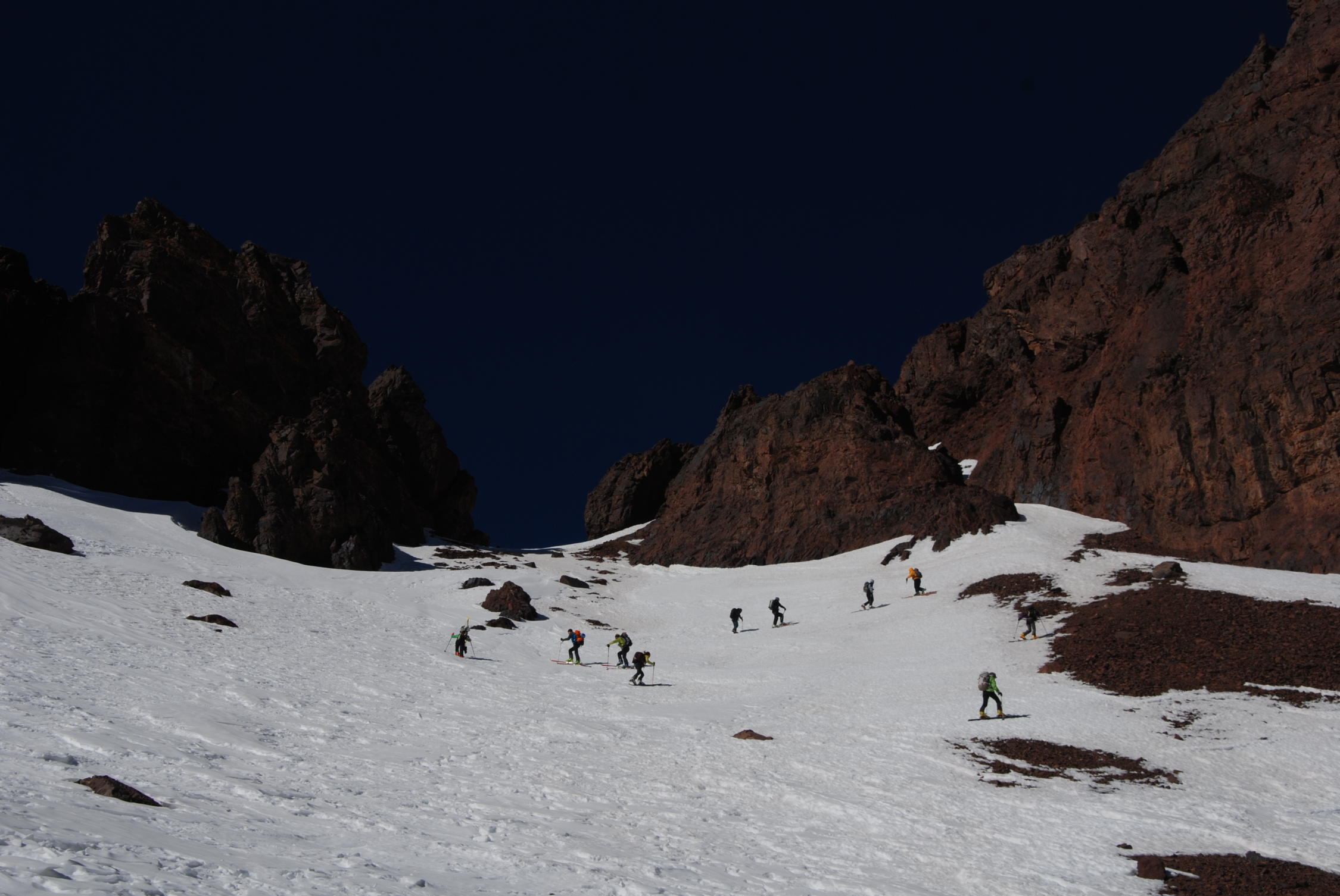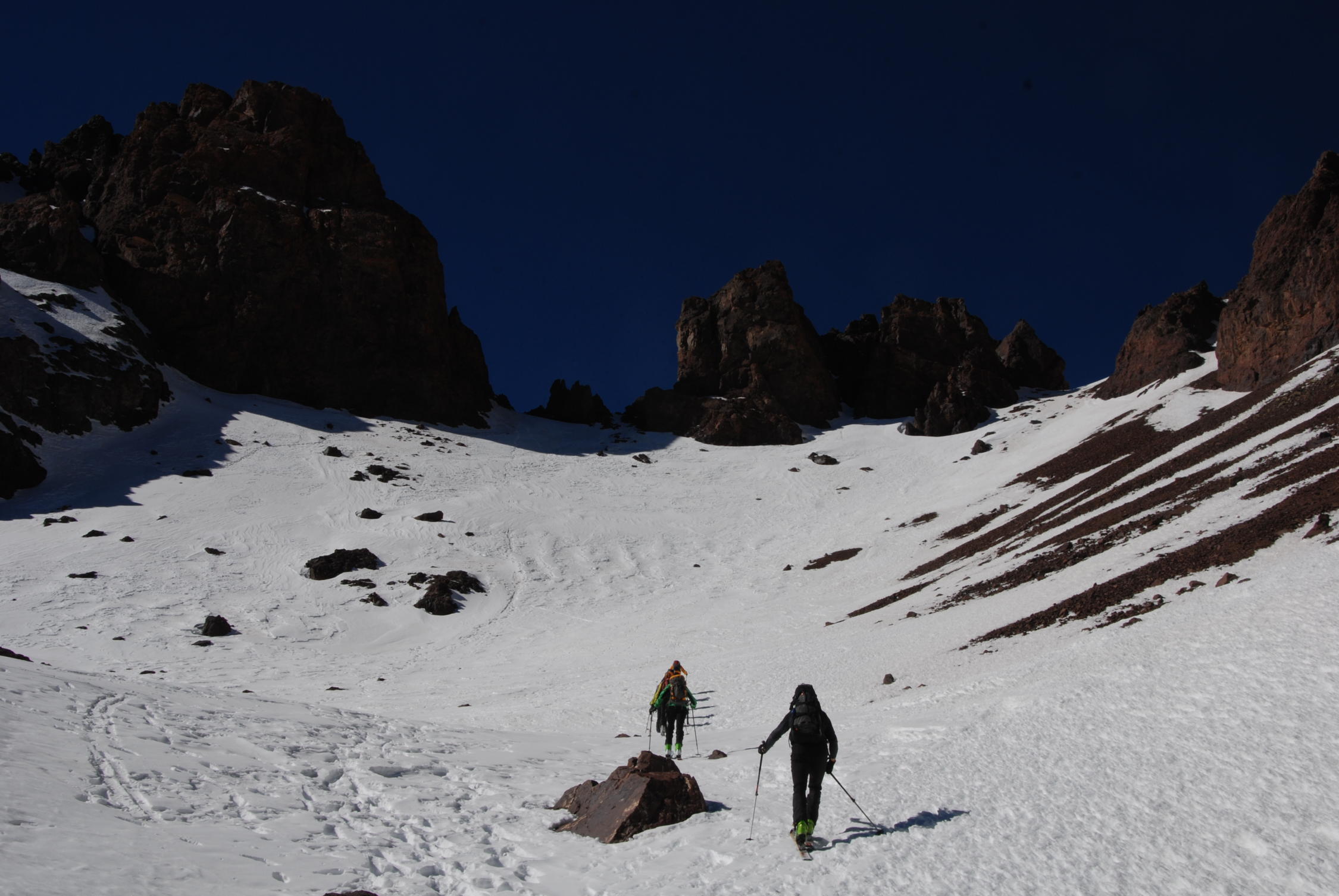 Ostanstieg Von der Toupkal Hütte geht es ca 45min gegen den Tizi N´Nouagane Pass hinauf und dann rechts in eine kleine Schlucht. Über kleine Eisfälle erreicht man nach weitere 30min einen offenen Kessel. Dort konnten wir die Schi anschnallen. Über mäßig steile Hänge geht es zu einem Plateau. Nach diesem in söstliche richtung über einen steilen Hang und zum Schluss einer Rinne gleichend zum Pass hinauf. Weiters kann man nur mehr zu Fuß den Gipfel erreichen.Abfahrt wie Aufstieg.