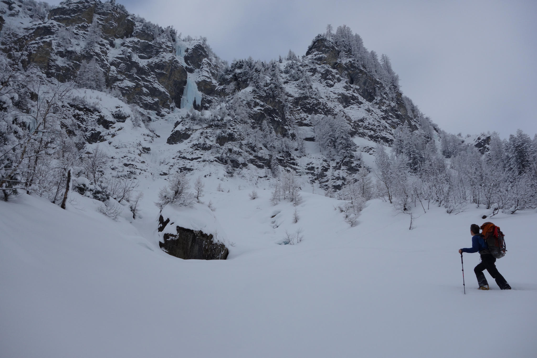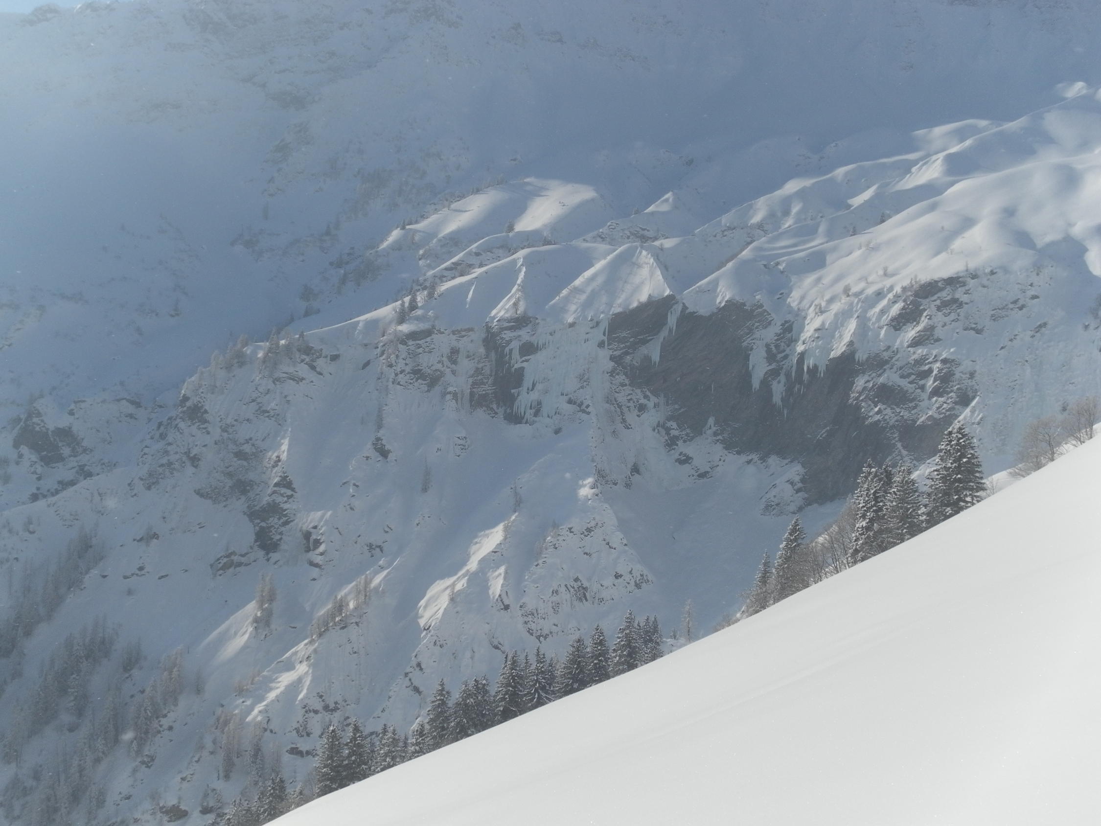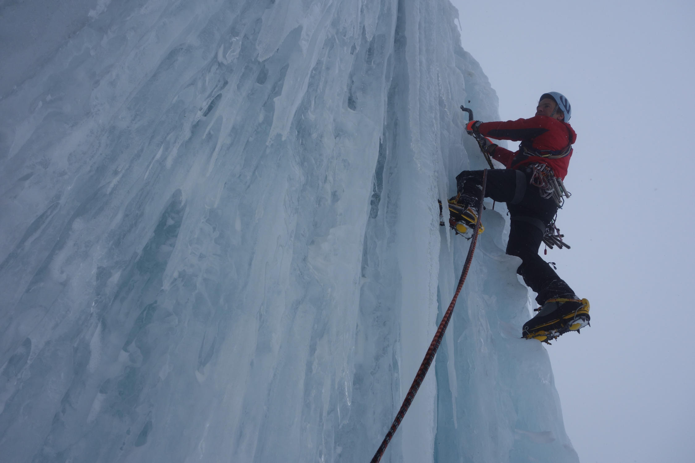 Super Verhältnisse! Dick gewachsenes, allerdings stellenweise hartes Eis. Im oberen Steilaufschwung haben wir eine Linie rechts gewählt, die Schwierigkeit hier liegt wohl eher im Bereich Wi5+.