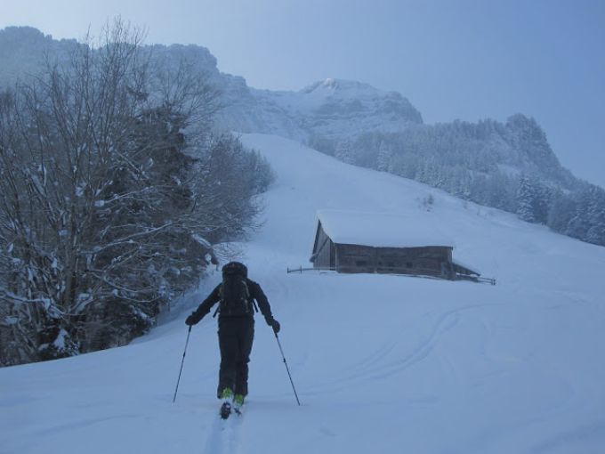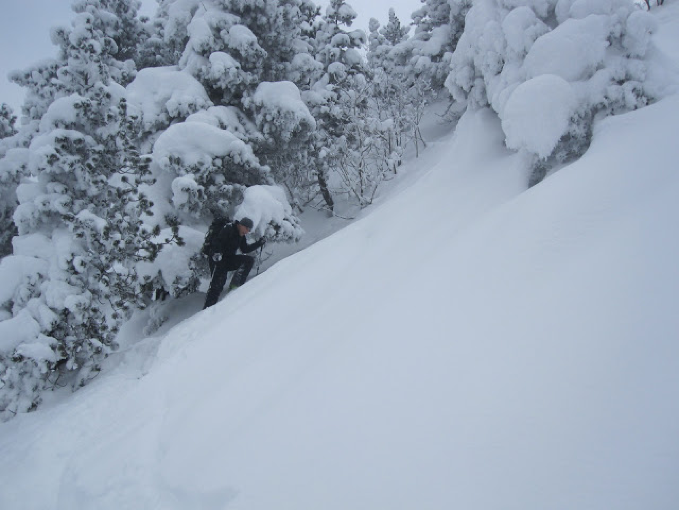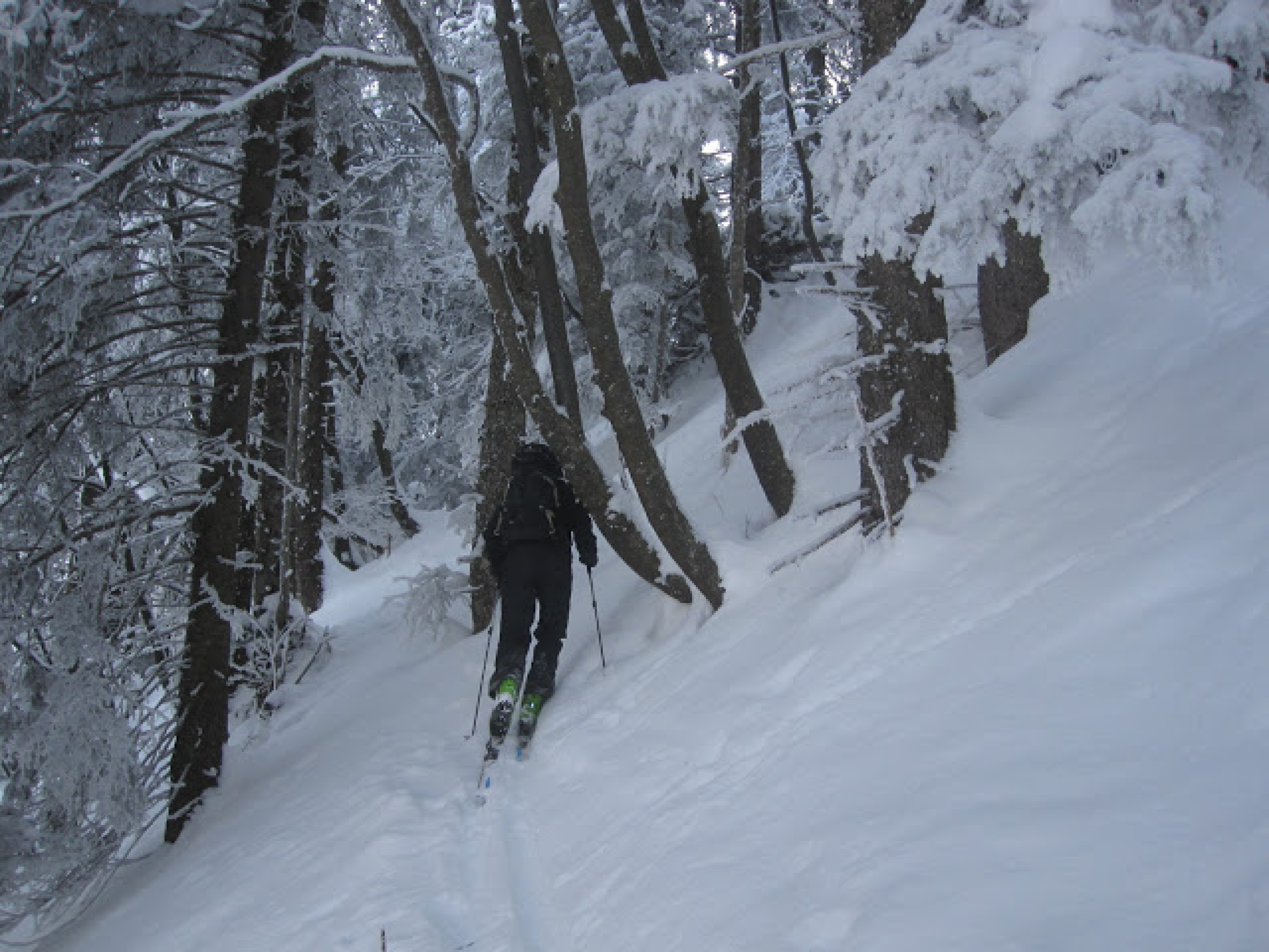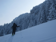 Gute Schneelage auf der ganzen Route. Alles nur Pulver, super ! Im Aufstieg teilweise aufgehellt, bei der Abfahrt teilweise leichter Schneefall.