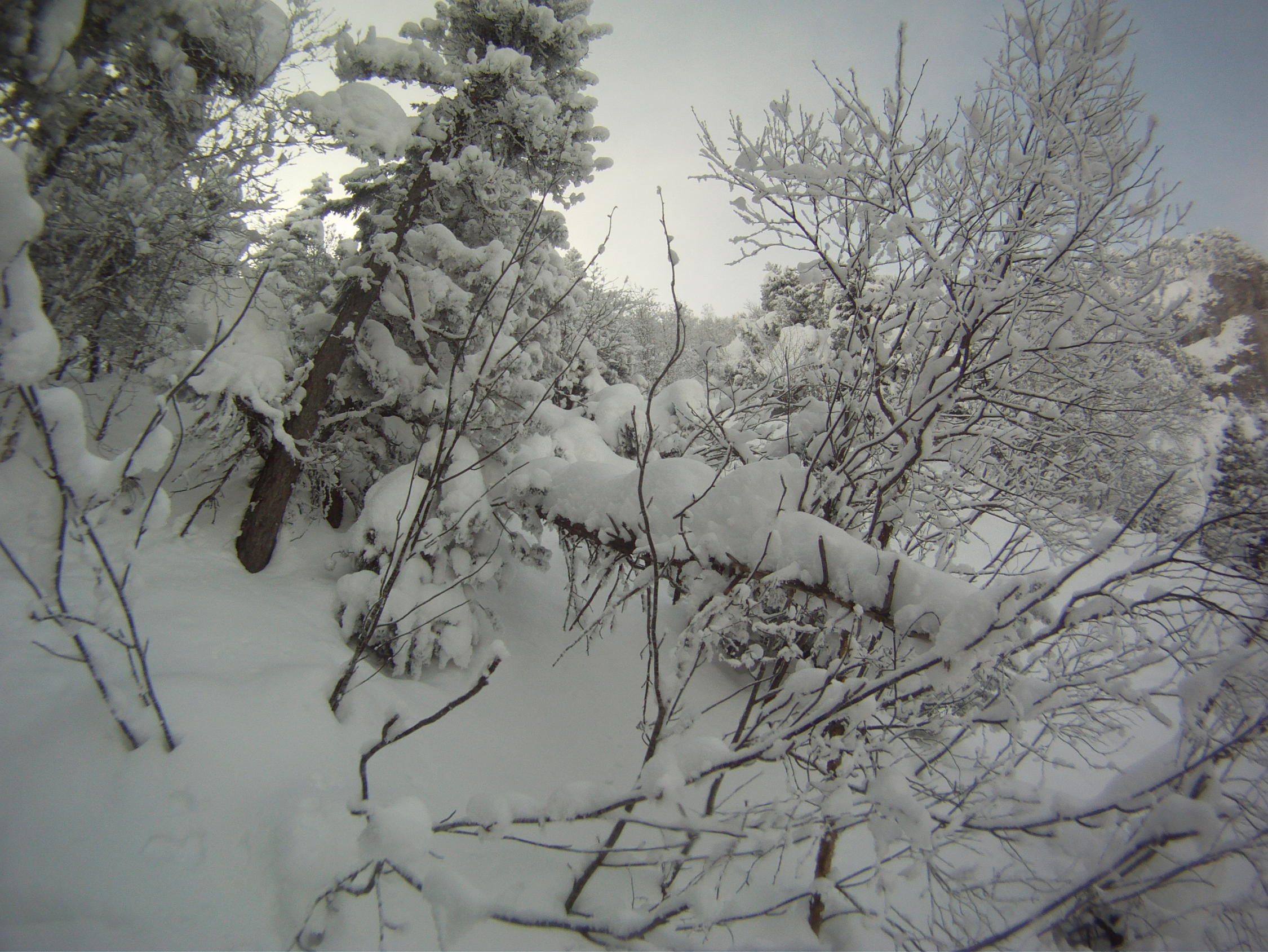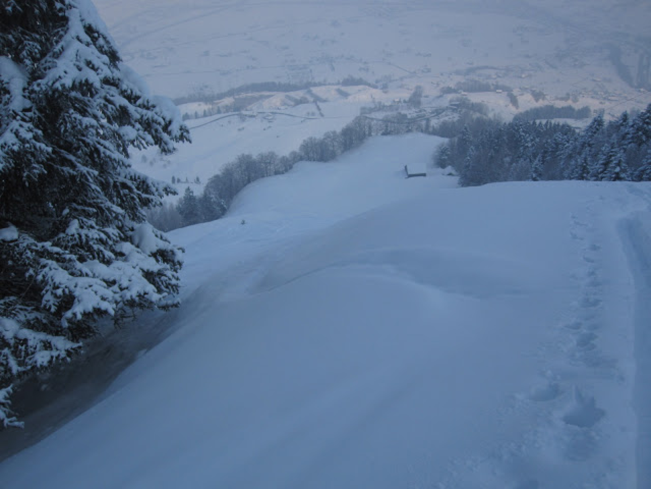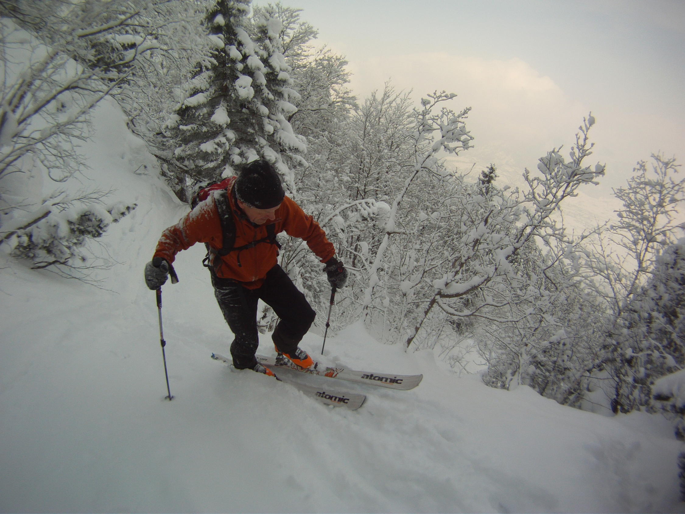 Gute Schneelage auf der ganzen Route. Alles nur Pulver, super ! Im Aufstieg teilweise aufgehellt, bei der Abfahrt teilweise leichter Schneefall.